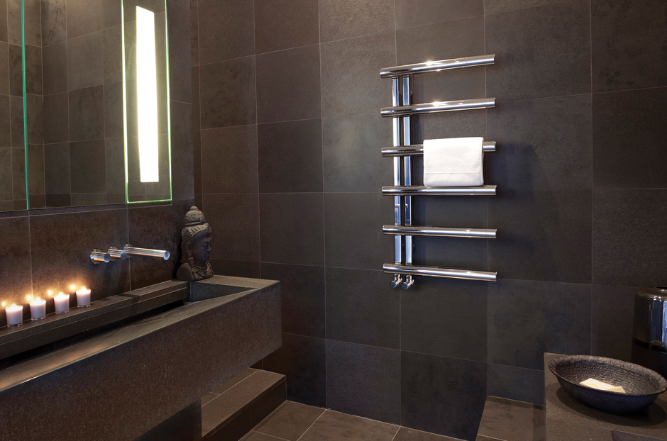 This gleaming towel warmer is a great all-rounder. Made from stainless steel, the polished finish it is perfect for wet rooms, alternativly you can now order the Chime in volcanic. With wide rung spacing also allows plenty of space for towels – great for family bathrooms. Its attractively chunky rails can be installed to left or right which is perfect for his and hers bathrooms. The Chime is available with dual fuel for summer use and also as an electric only version.