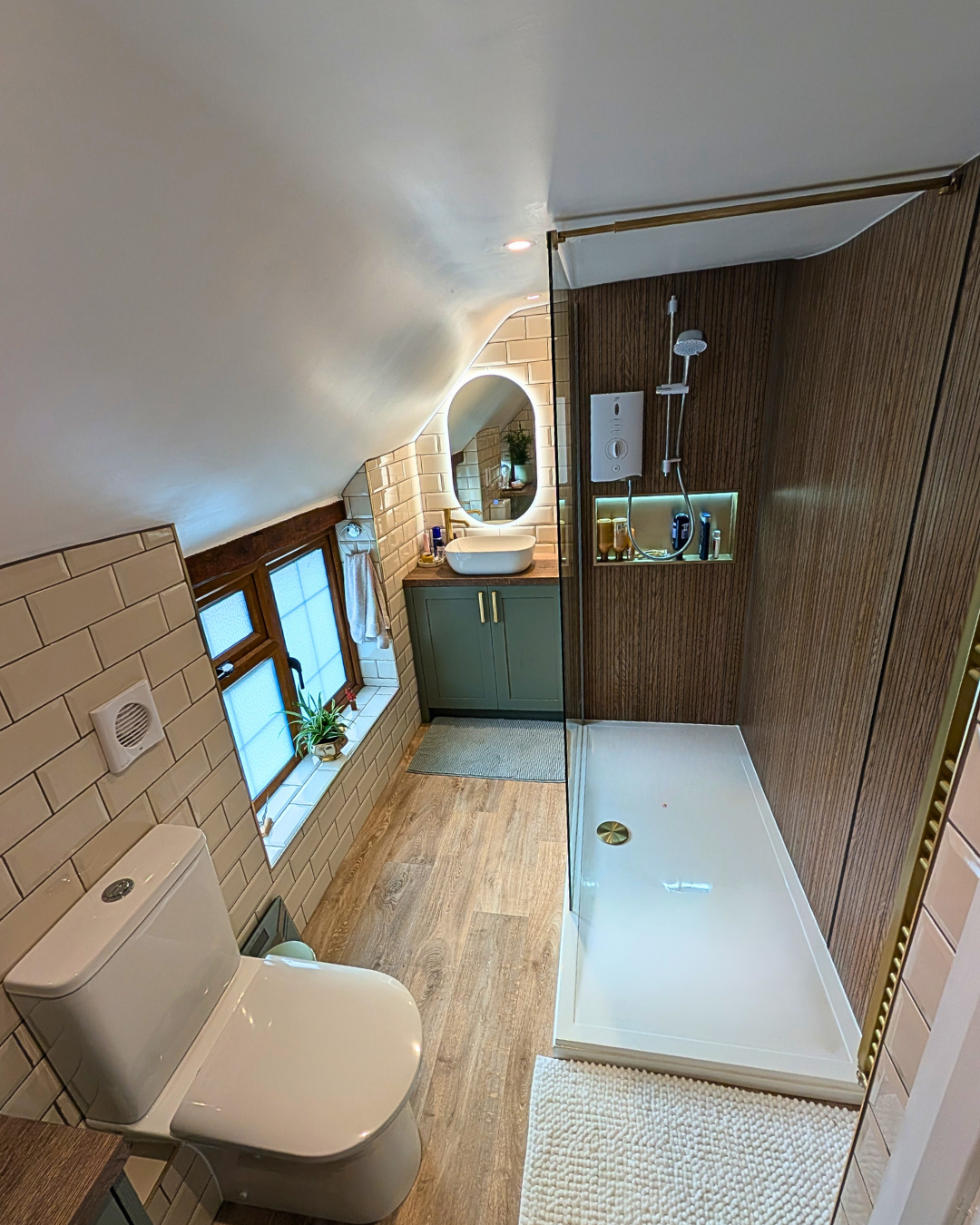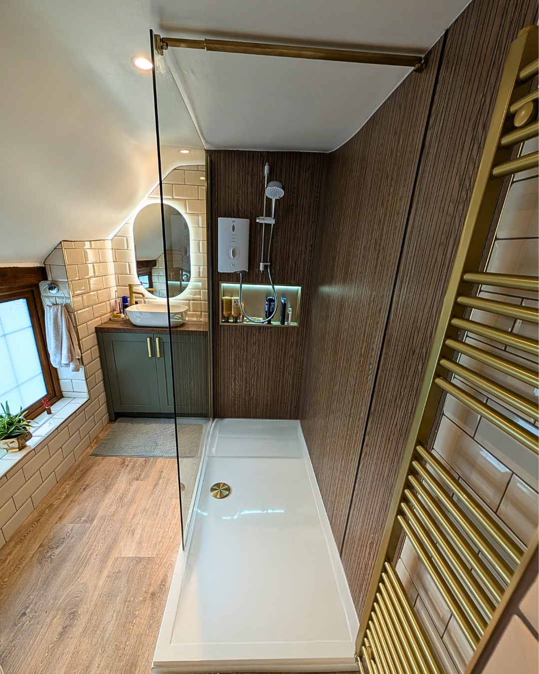 The walk in shower showcases wet wall panels in Linear Oak, adding a striking feature while providing depth and warmth.