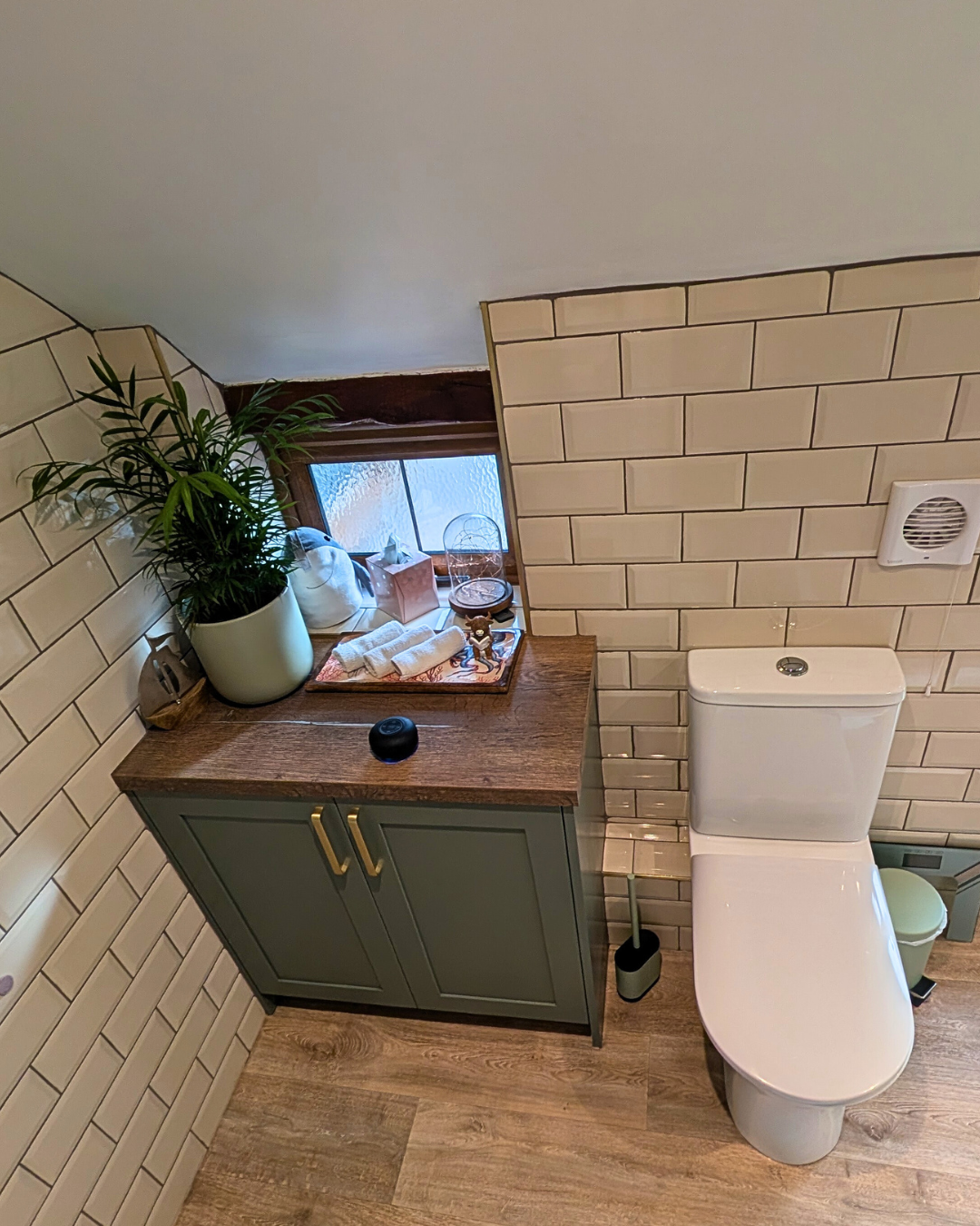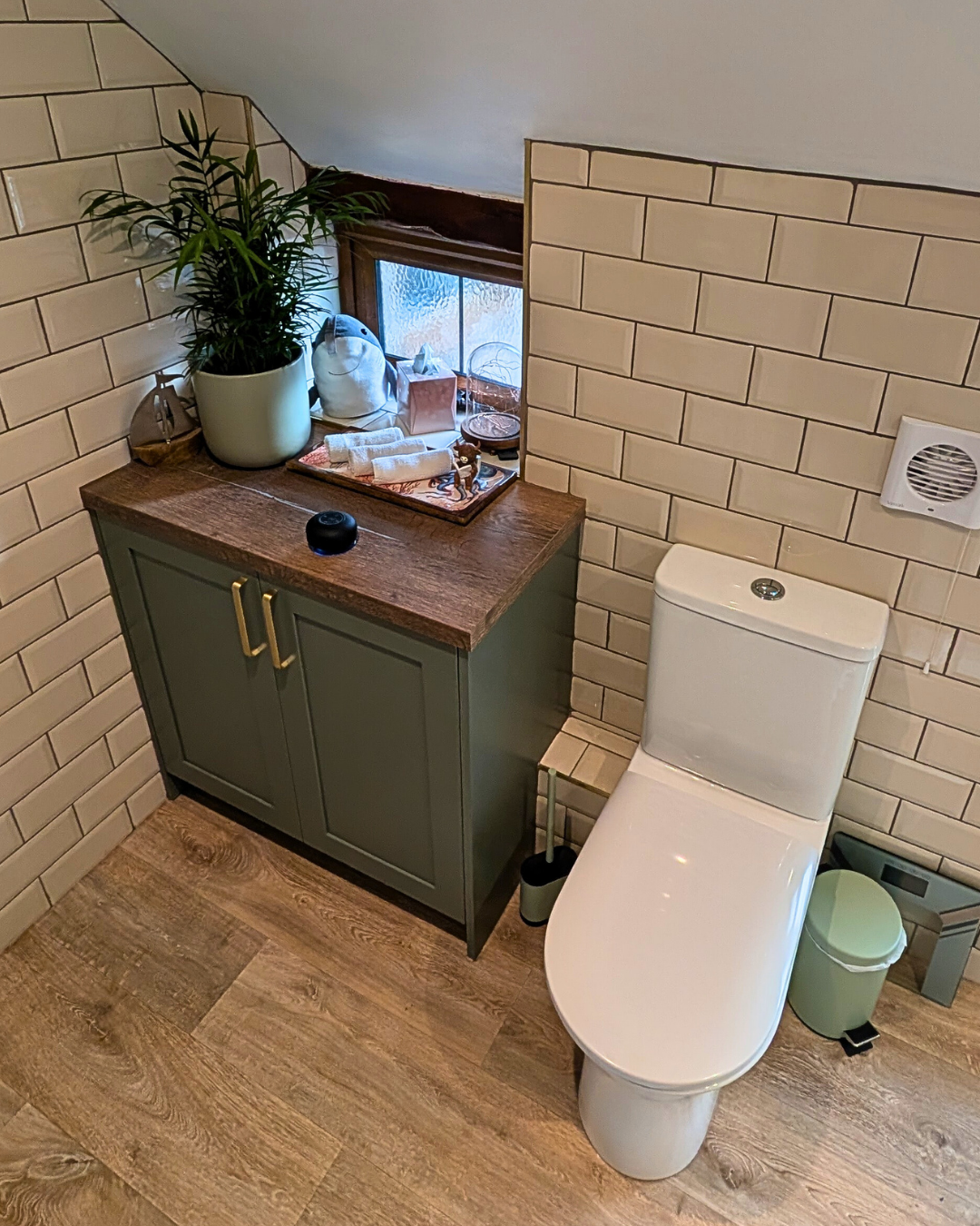 Cream metro tiles complement various décor styles and pair well with diverse cabinet colours, including green. They offer a warmer, softer alternative to white, that suits traditional and contemporary styles. Making them the perfect choice for this design.