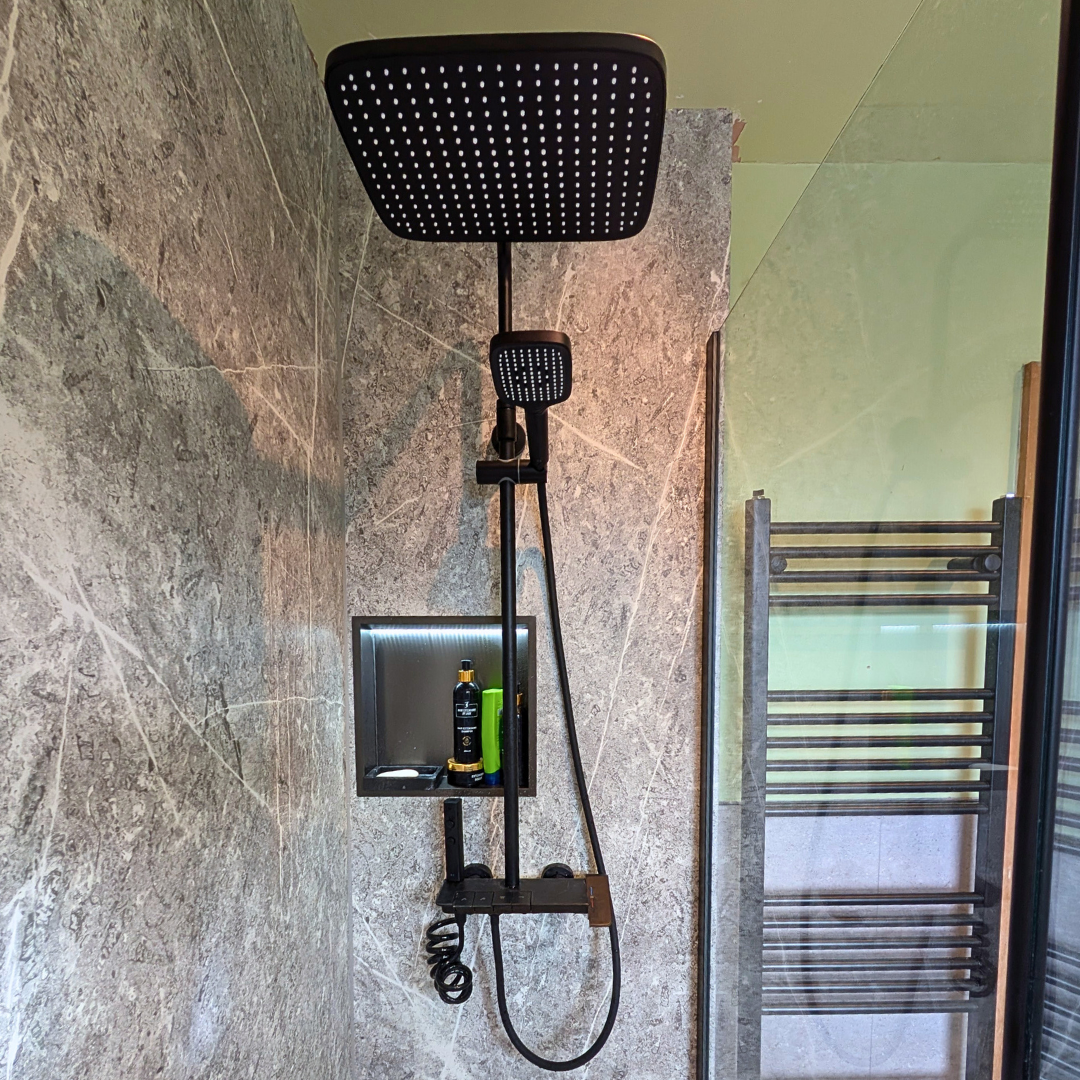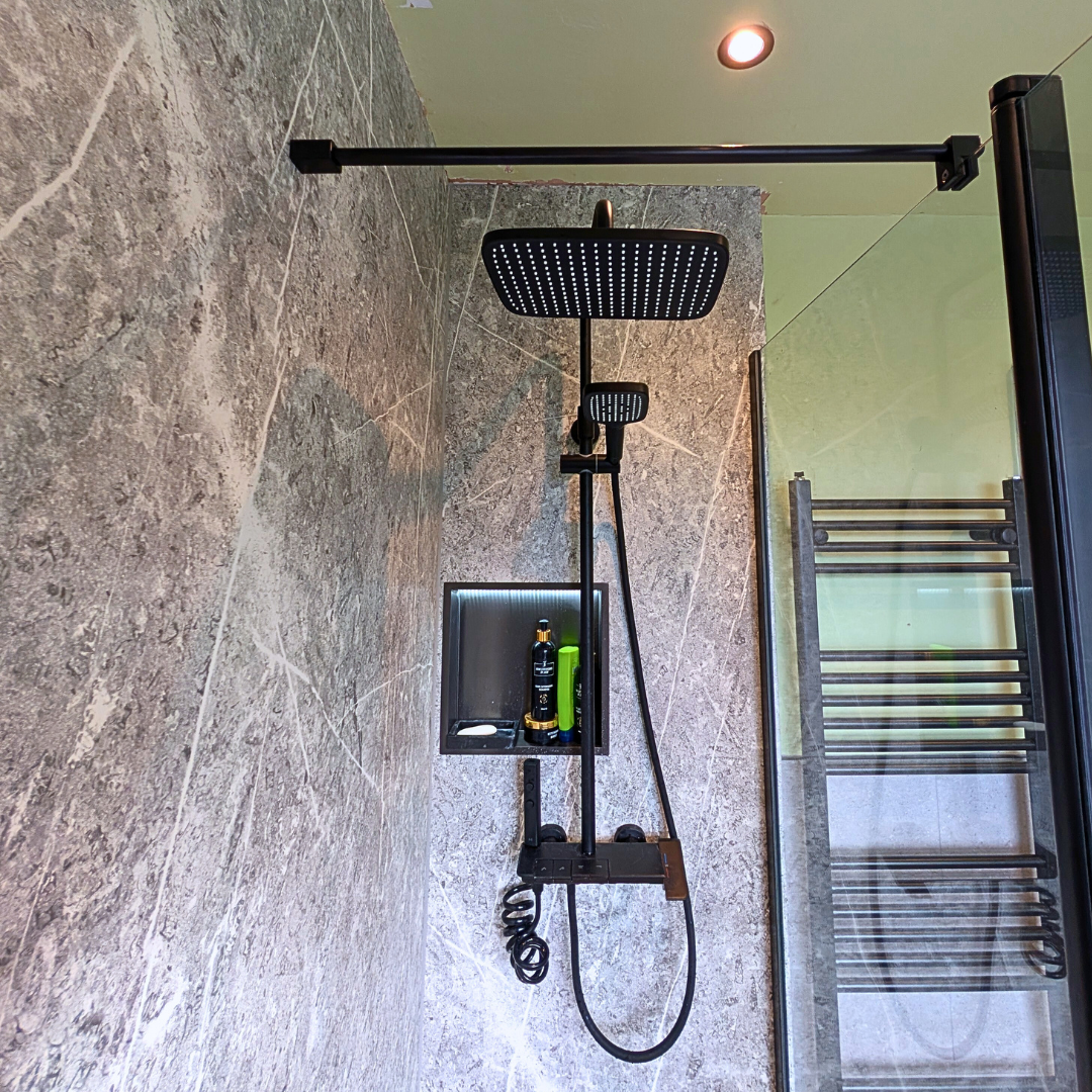 Featuring in the walk in shower is the large overhead shower head, providing a complete showering experience. Additionally, it includes a height adjustable riser rail shower head that can also be hand held. The thermostatic control has a convenient shelf and a ‘piano’ style set up, allowing the user to select from various settings. We currently have this shower, fully operational, in our showroom for demonstration.