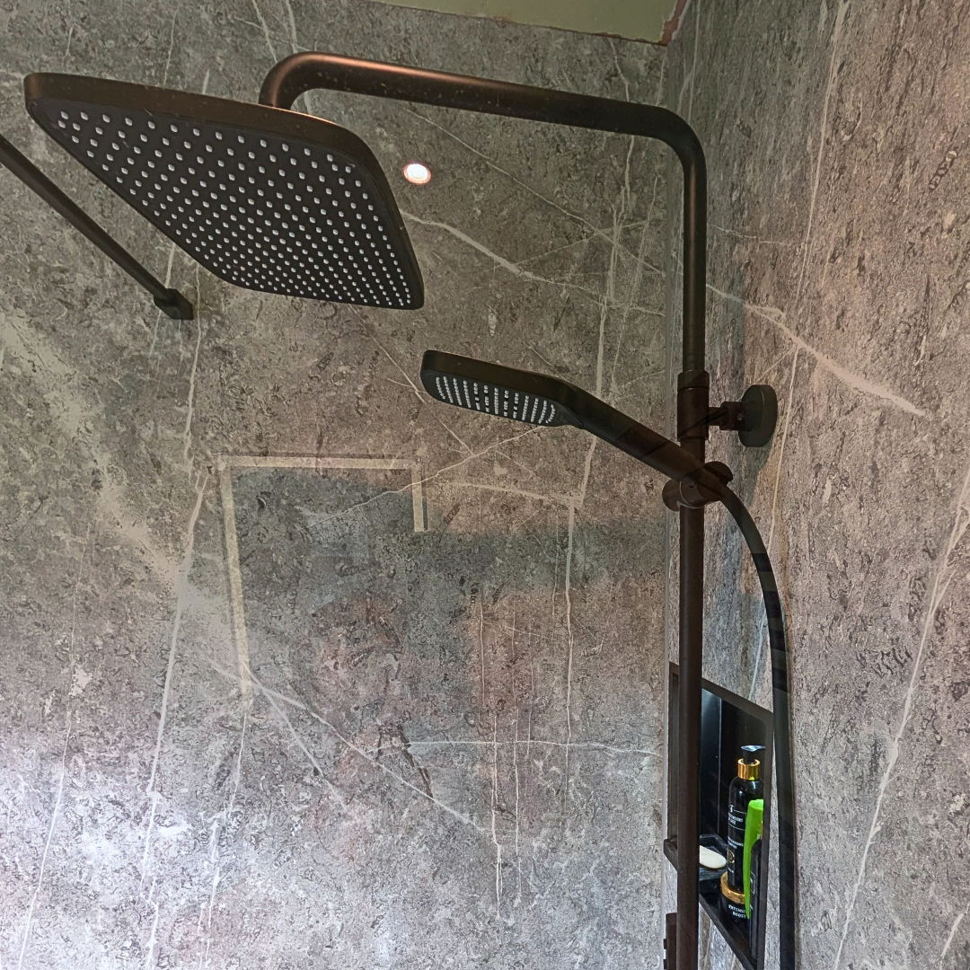 Surrounding the shower are the wet wall panels in White Lightening Fossil.
