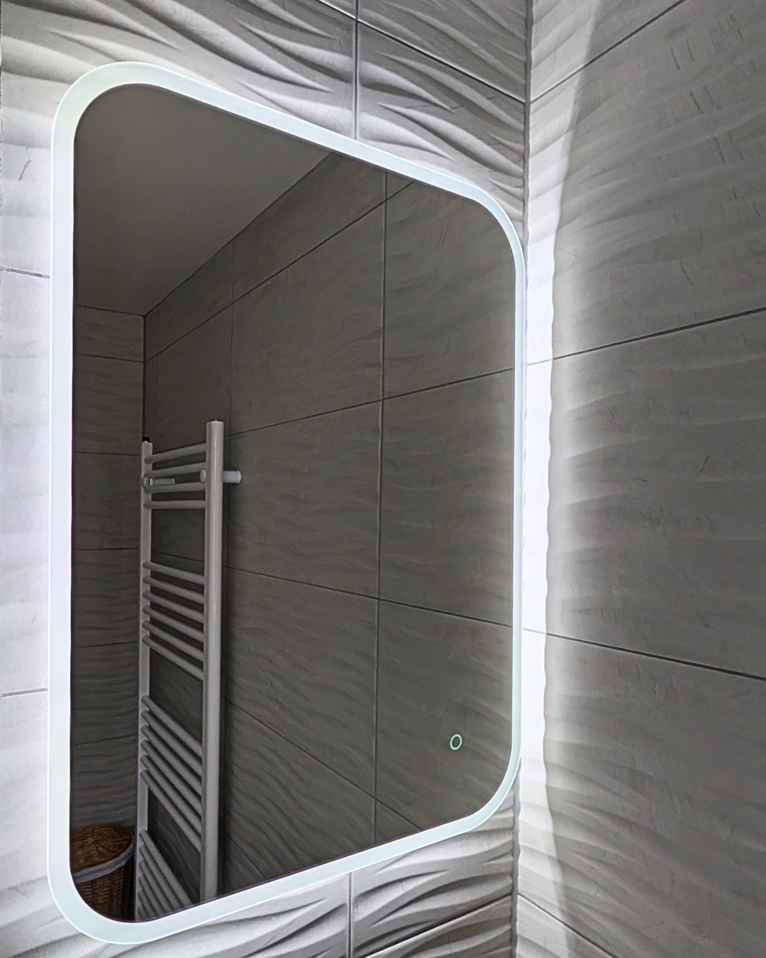 The backlit mirror above the basin features a captivating 3D effect, highlighting the stunning wave design in the wall tiles. Wave patterns evoke a sense of tranquillity by imitating natural elements, such as the flow of water.