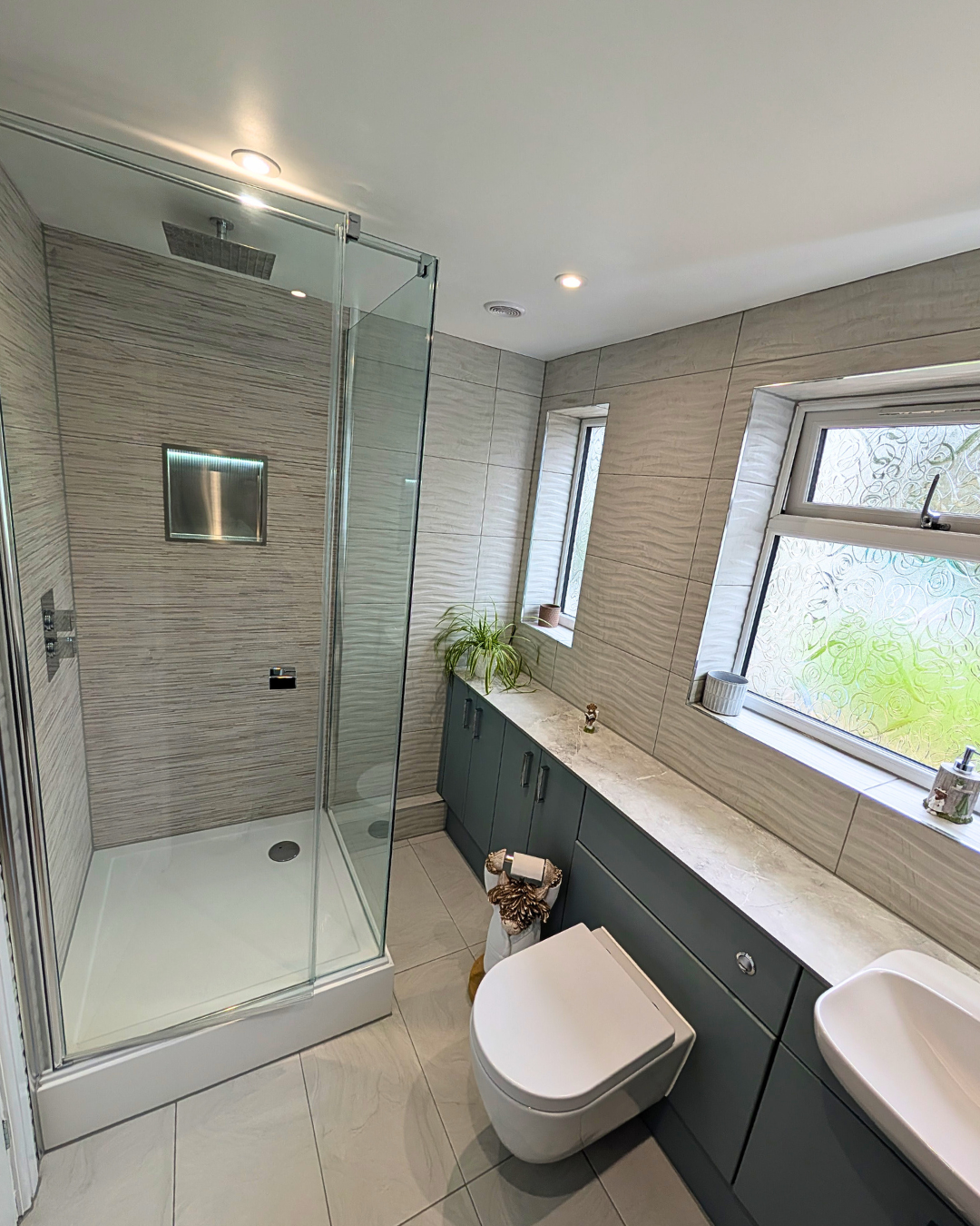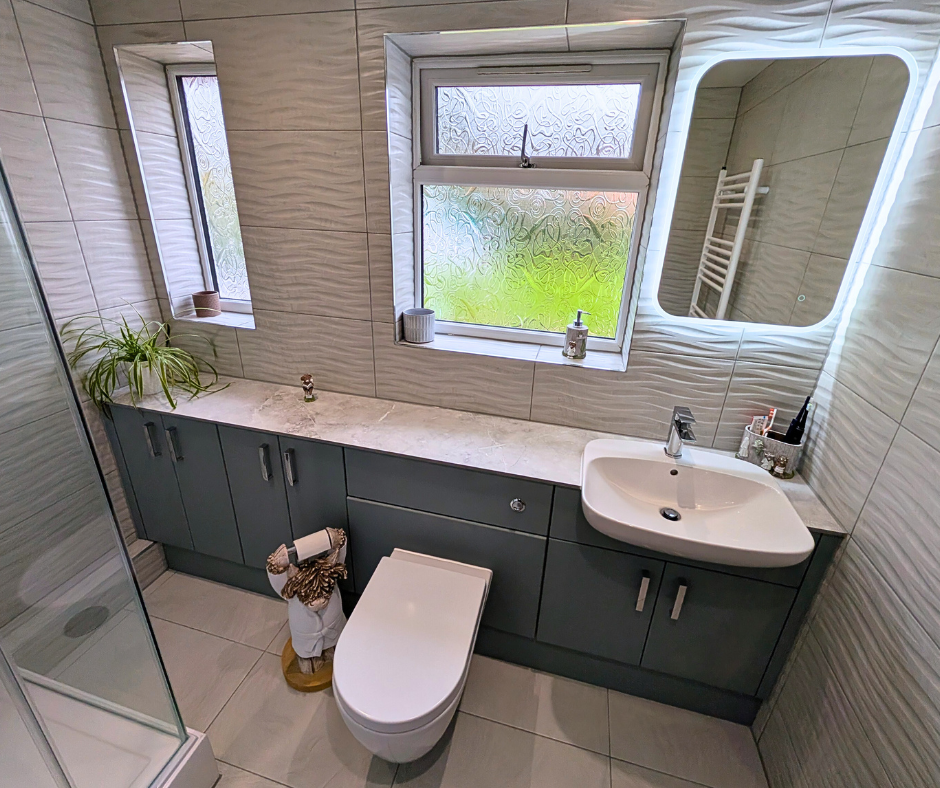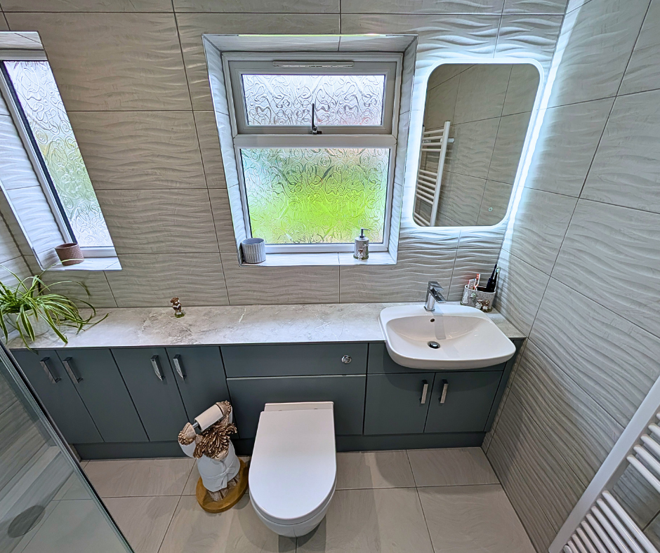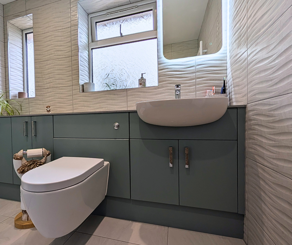 A beautiful bathroom that offers plenty of storage with the Utopia fitted furniture in Sea Green. The Sea Green adds a gentle splash of colour, infusing the room with warmth. The 12mm solid laminate worktop in Light Grey Marble lays on the units effortlessly, blending in beautifully with the aesthetics of the room. With full width units and worktop, you will enjoy maximum workspace for your daily grooming routines.