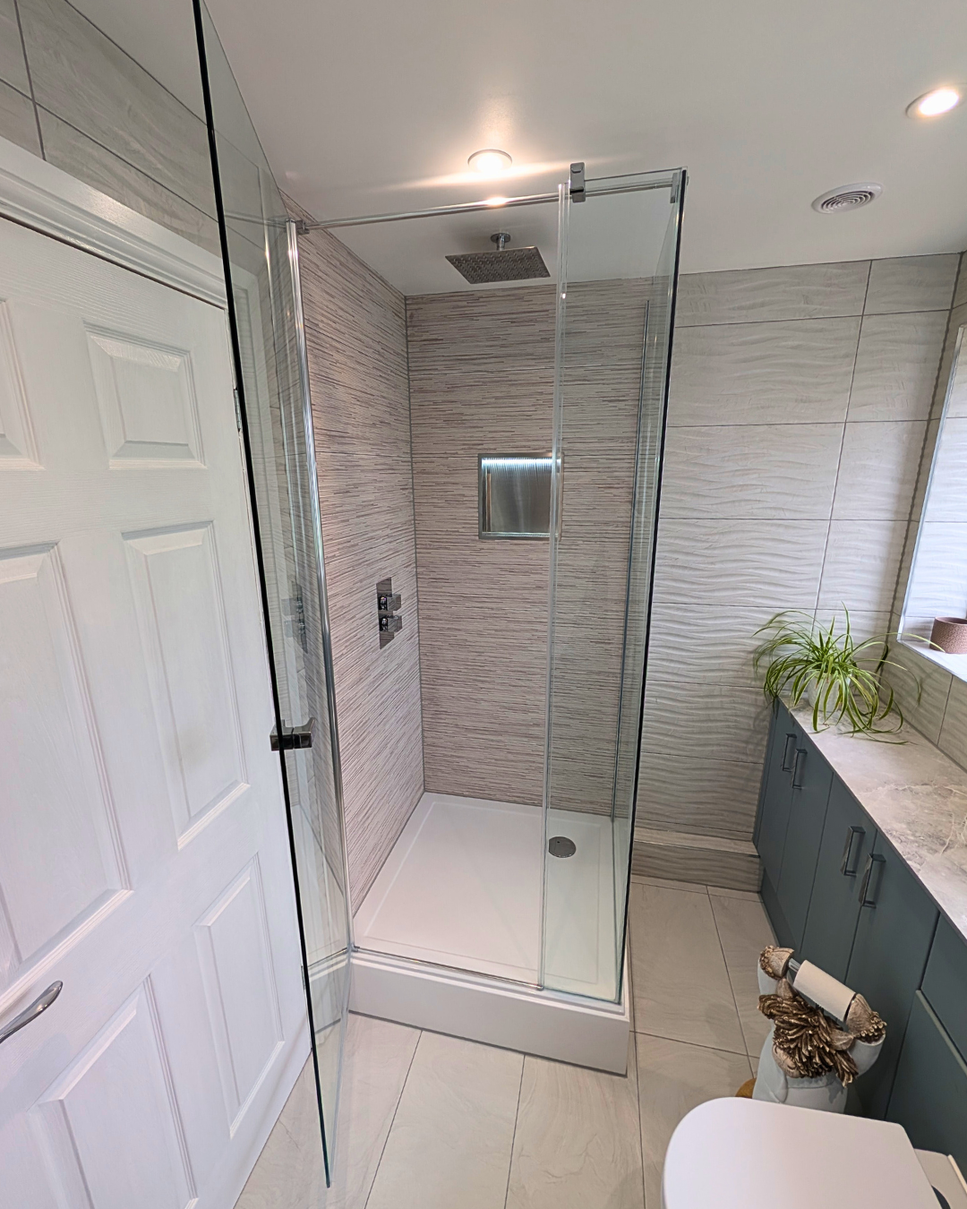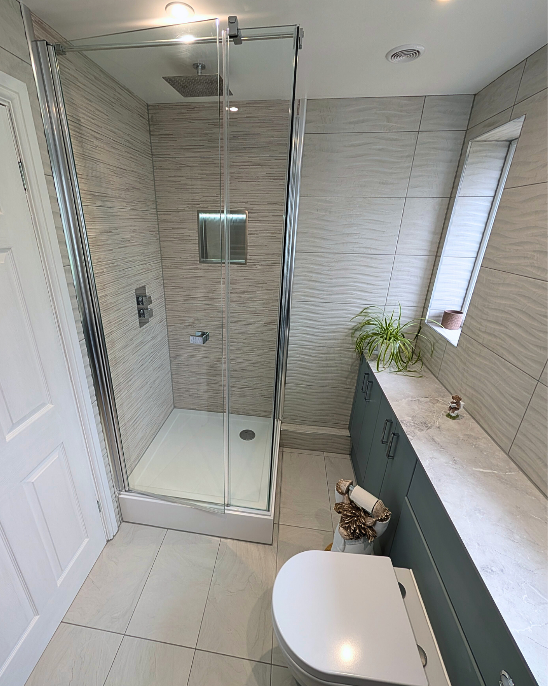 The corner shower is spacious and includes a convenient illuminated recessed shower shelf, perfect for storing bottles whilst in the shower, keeping the tray clutter free.