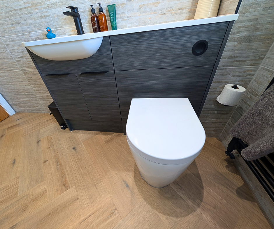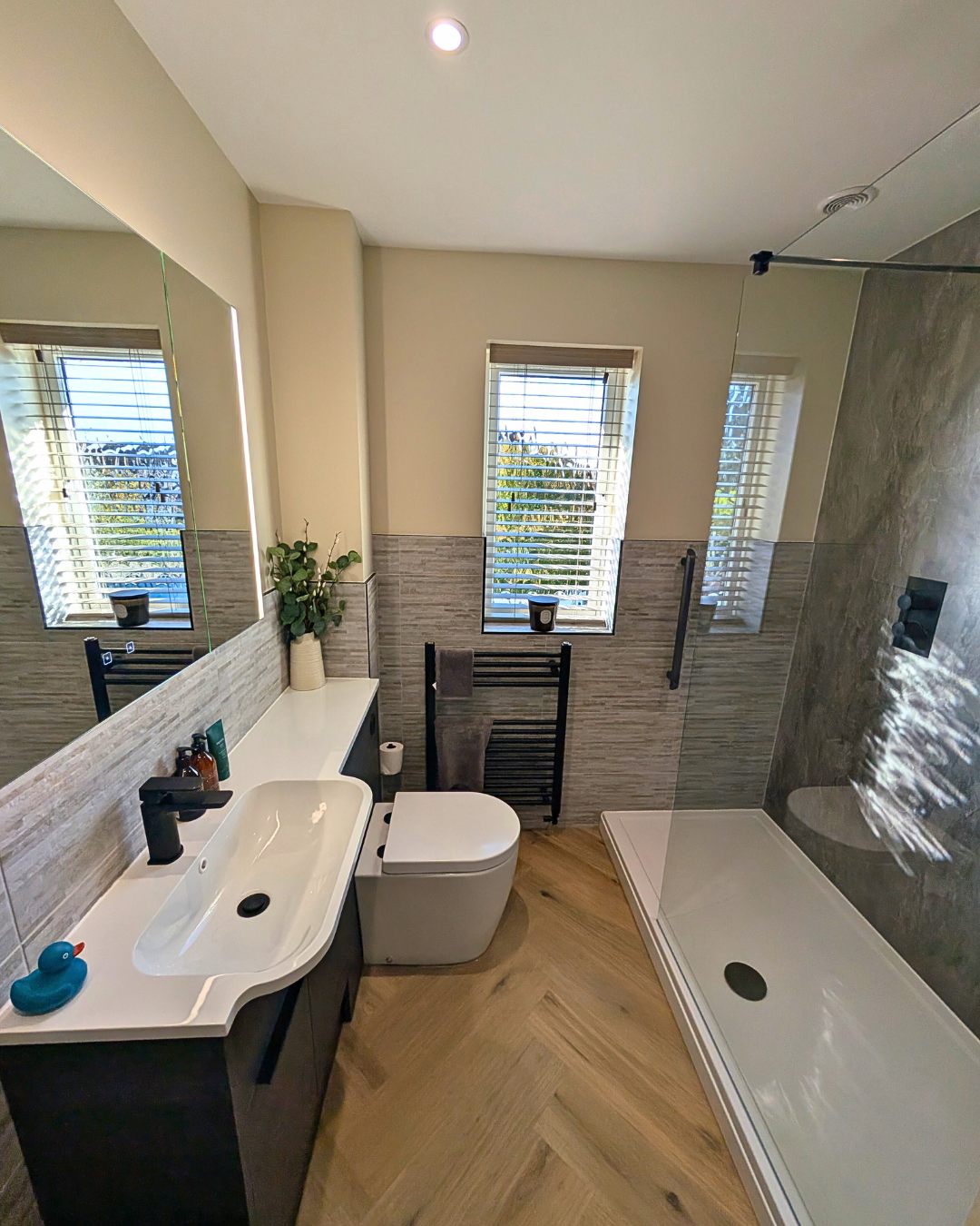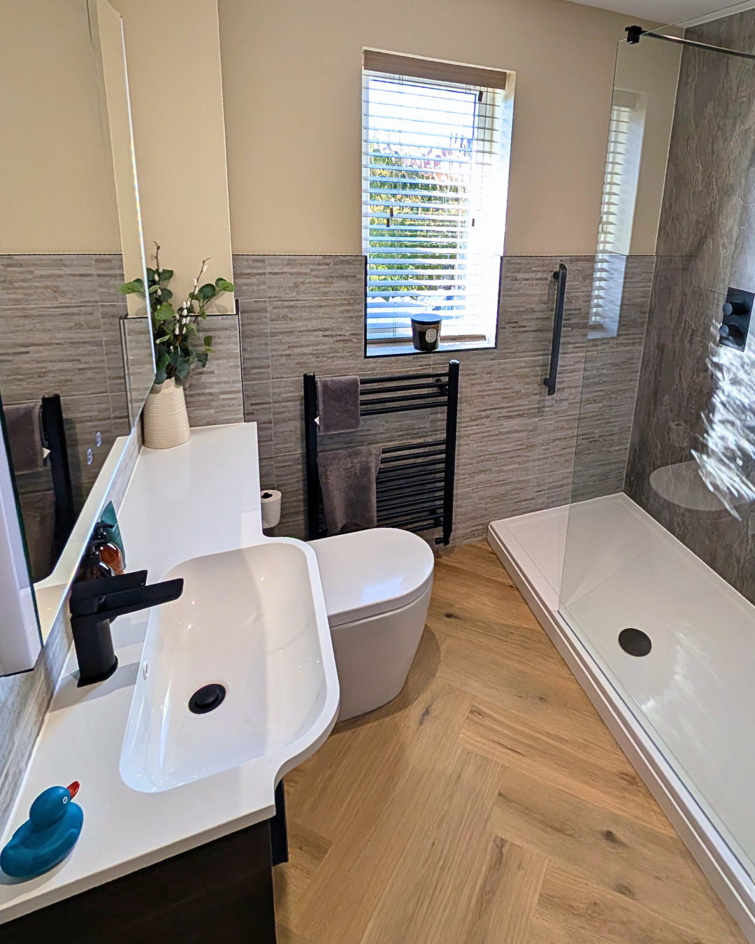 Completing the bathroom is the stunning Karndean flooring in Canadian Urban Oak. The Herringbone finish is a popular choice, especially in smaller rooms, as it can provide the illusion of space due to the zig zag pattern.
