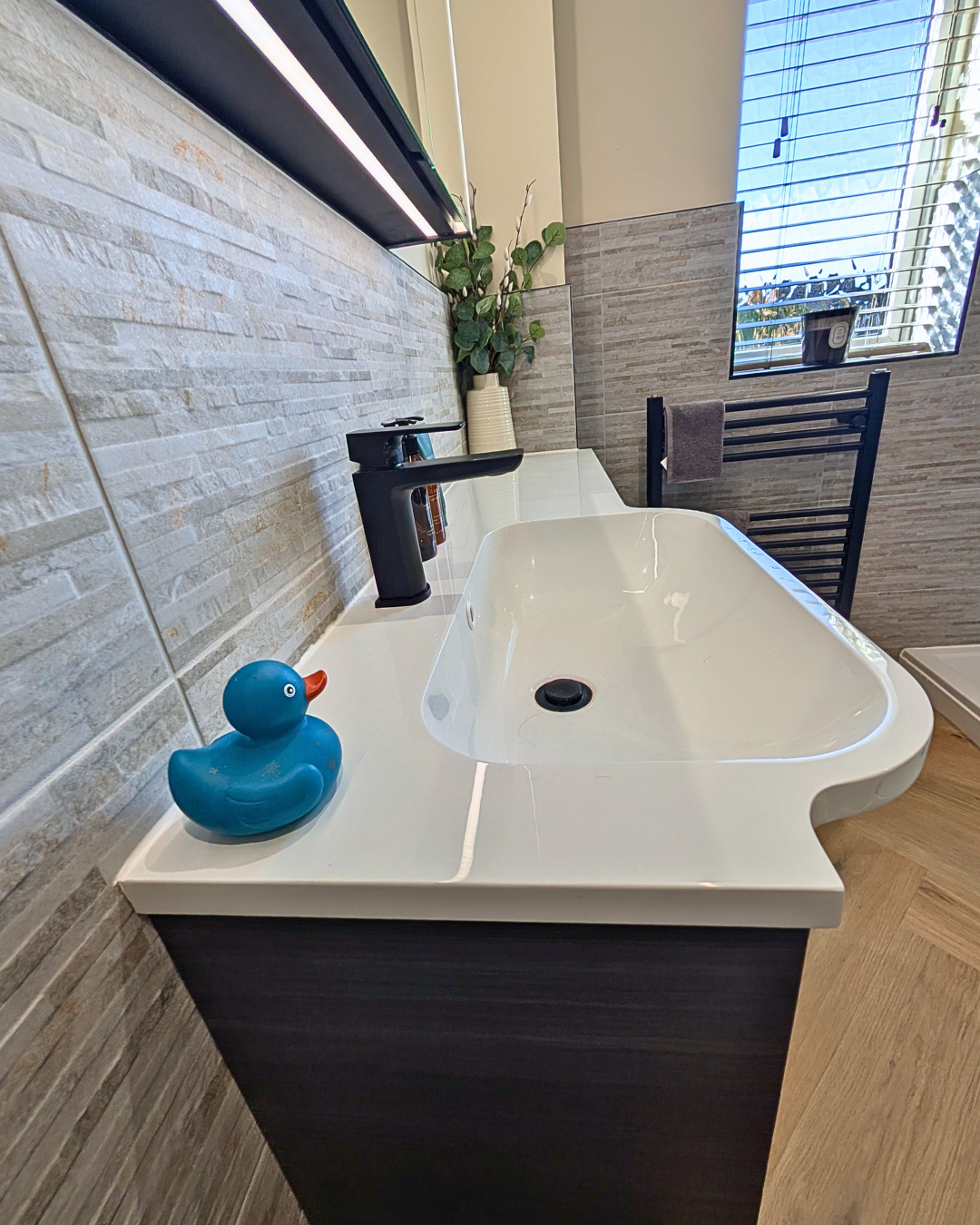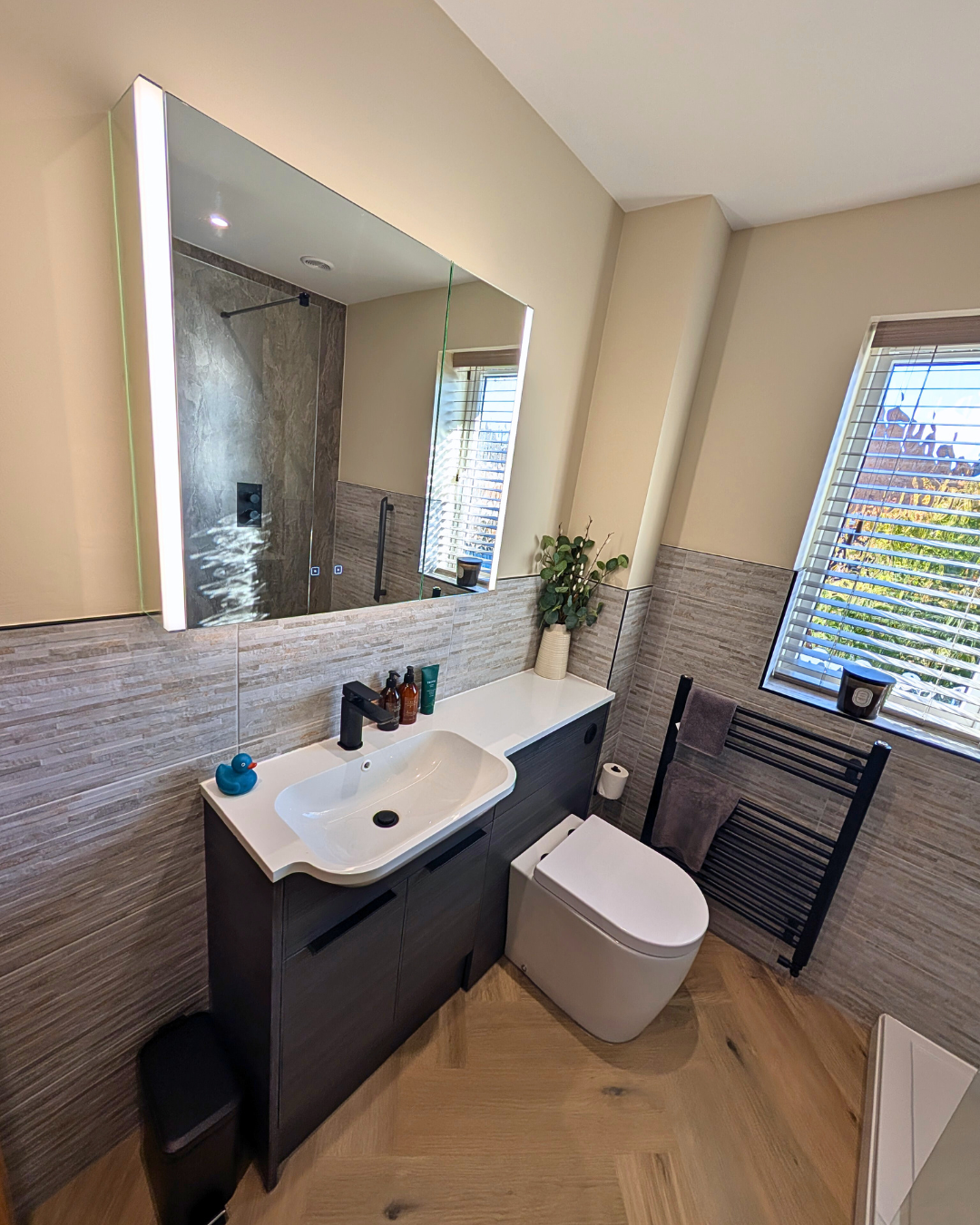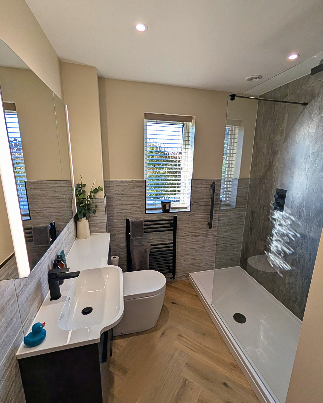 Completing the bathroom is the stunning Karndean flooring in Canadian Urban Oak. The Herringbone finish is a popular choice, especially in smaller rooms, as it can provide the illusion of space due to the zig zag pattern.