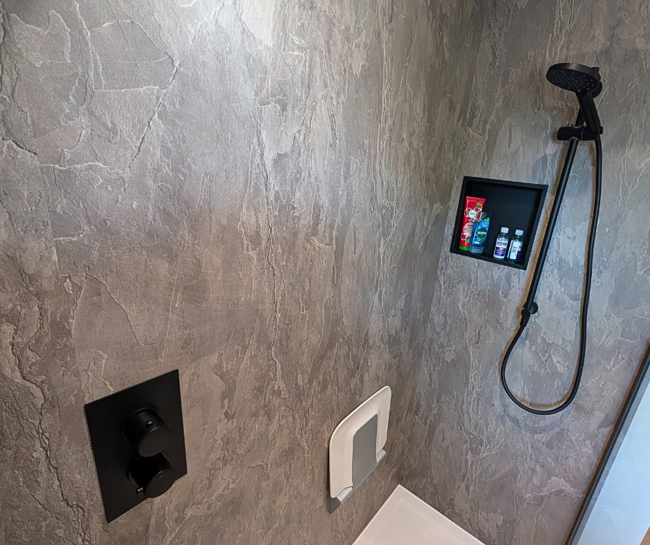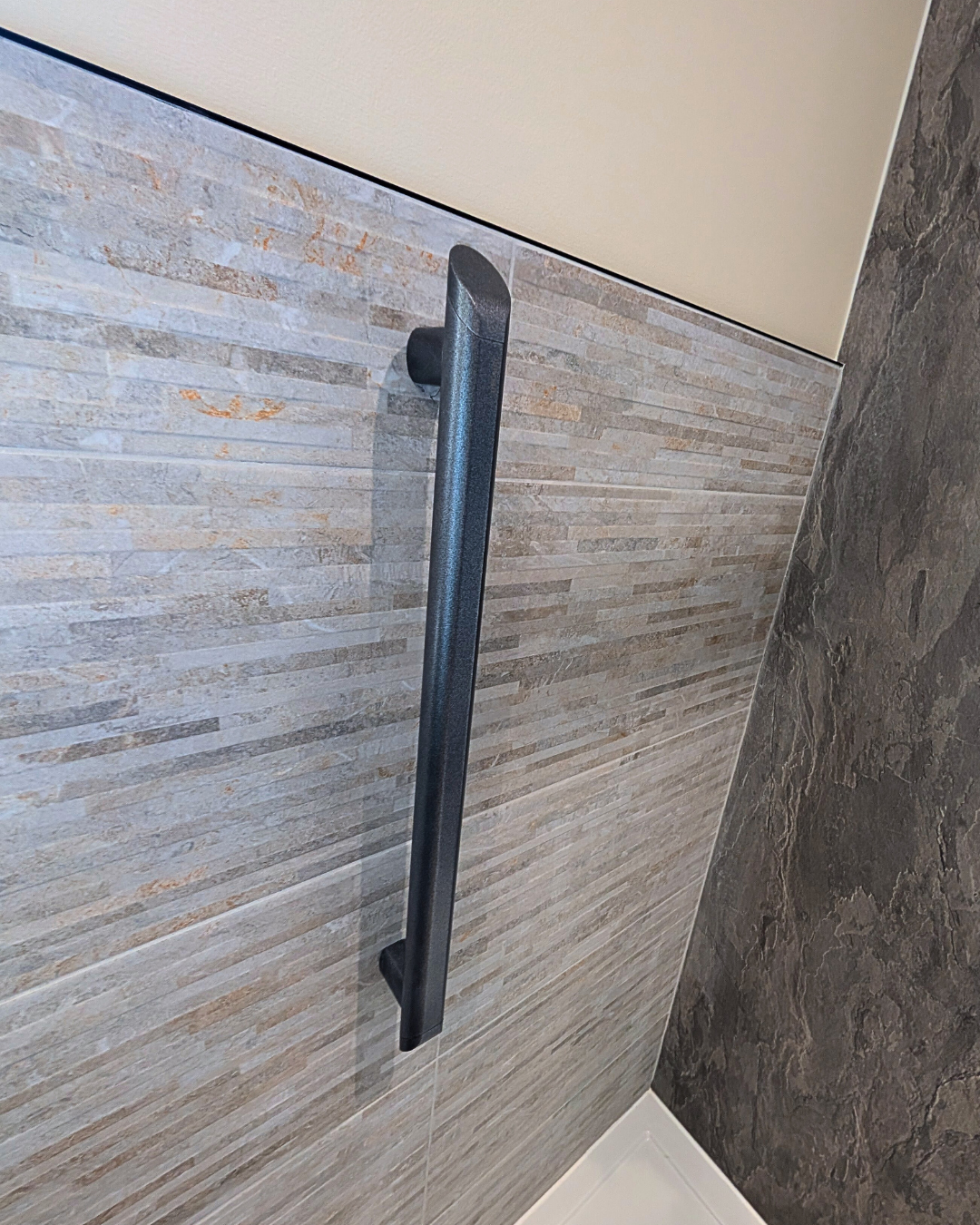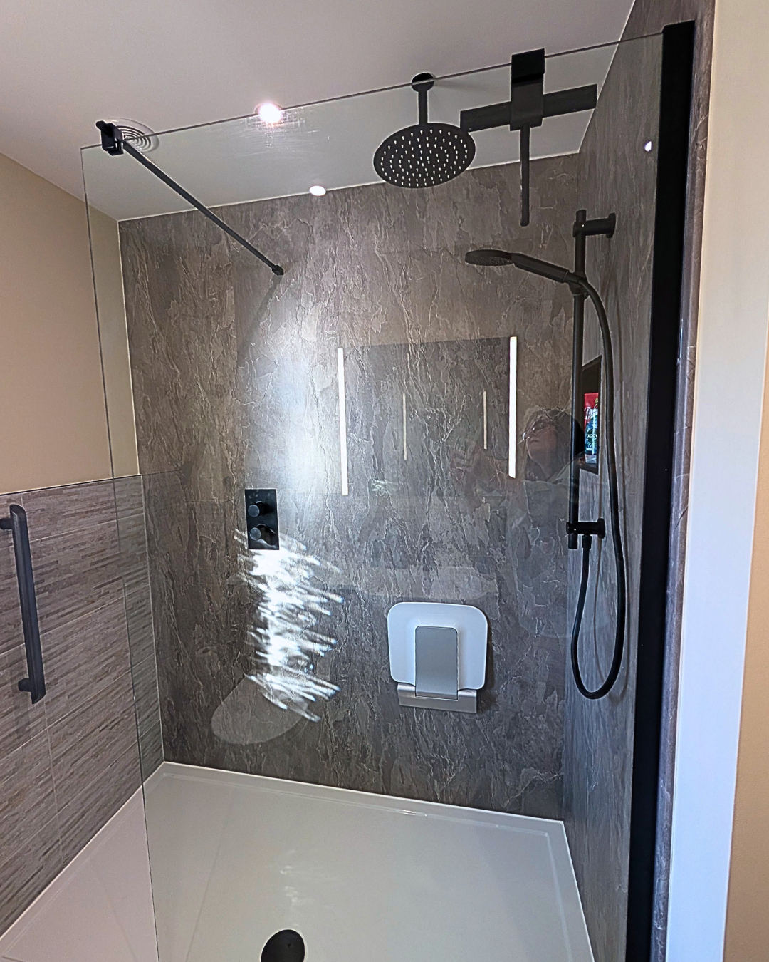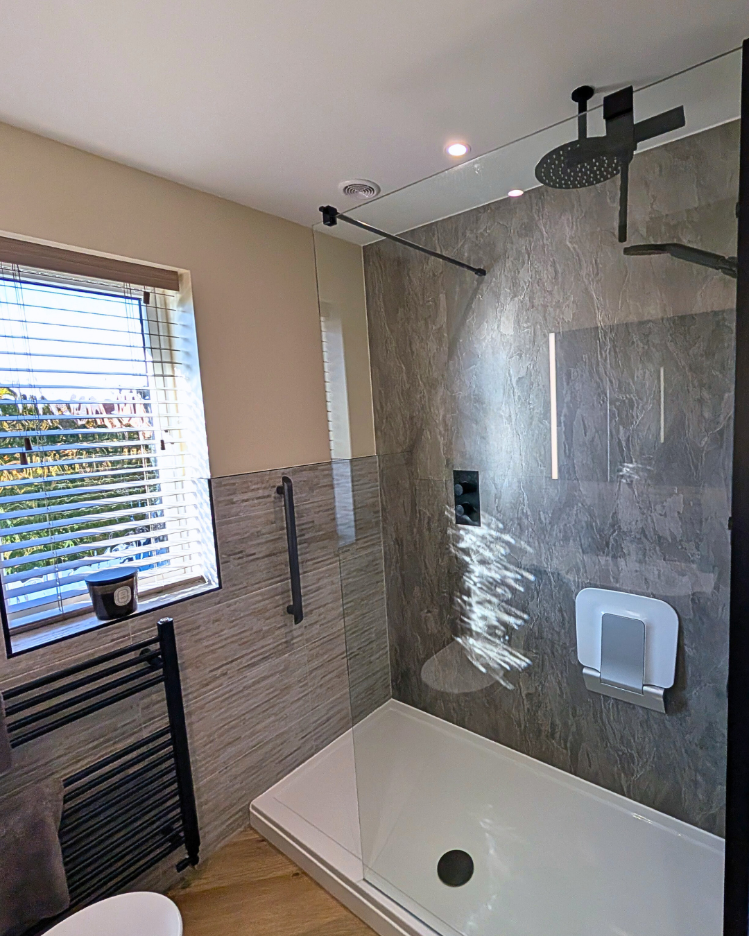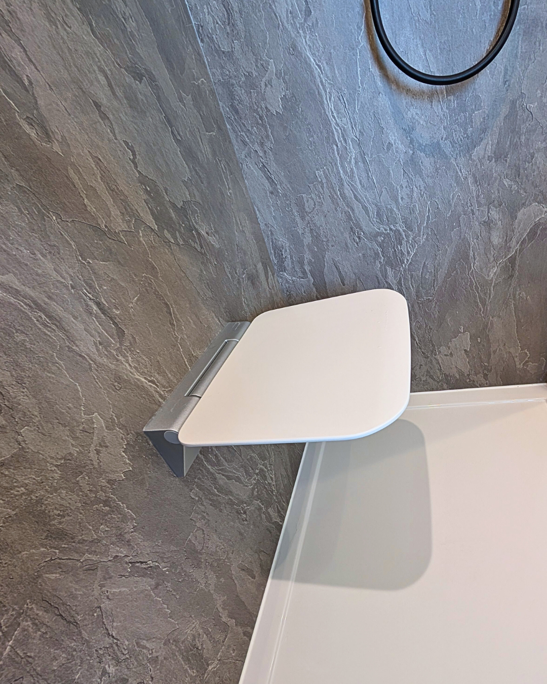 Adjacent to the furniture is the walk in shower area. Including a grab bar is an excellent way to offer support to users, allowing for optimal positioning based on your individual needs. Adding a shower seat is a further way of providing a safe and comfortable environment for the user, instilling confidence whilst showering.