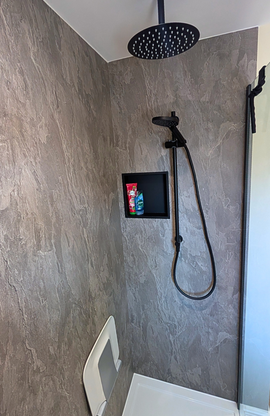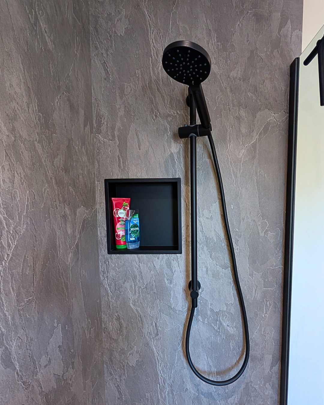 The niche on the shower wall is a practical storage solution for bottles, keeping the tray clutter free.