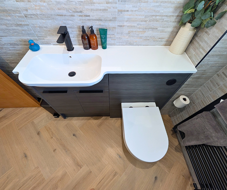 The Utopia fitted furniture in Strata Anthracite provides storage with its two door cupboard and the toilet unit conceals the cistern, maintaining a seamless design. The All-In-One worktop and basin creates a minimal feel that effortlessly integrates with the furniture, providing plenty of work space for your toiletries.