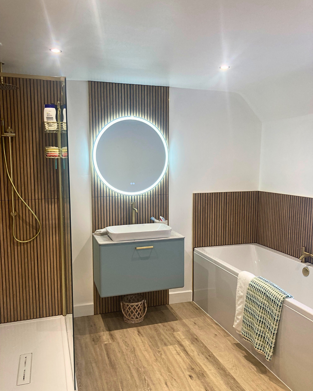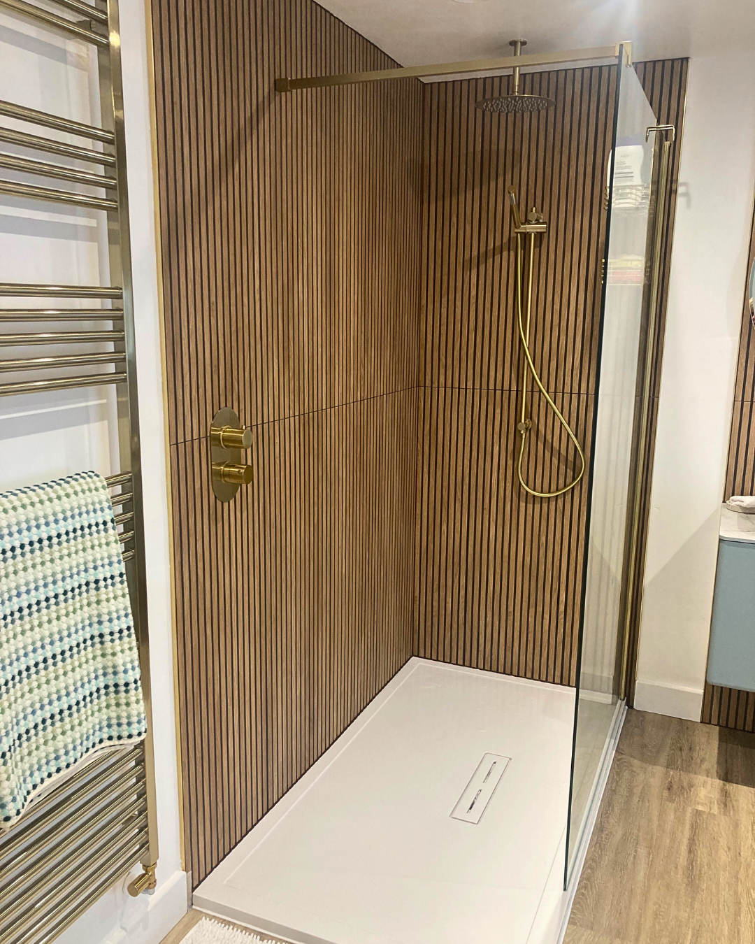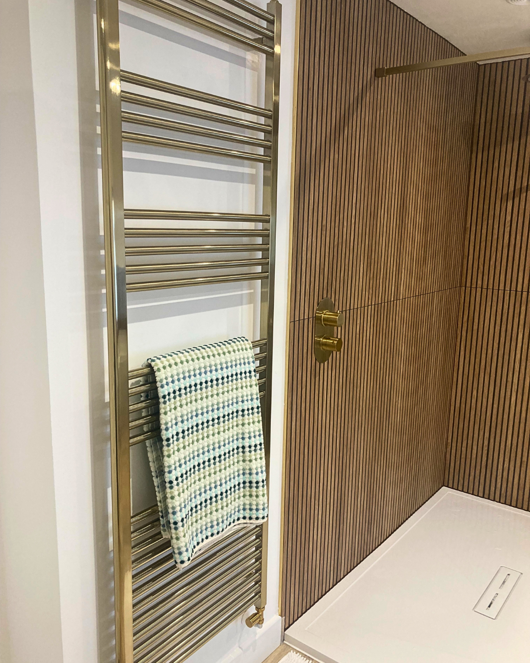 Throughout the bathroom the brass theme is present in the taps, handles, shower fixtures and radiator, showcasing warm golden tones that exude luxury.