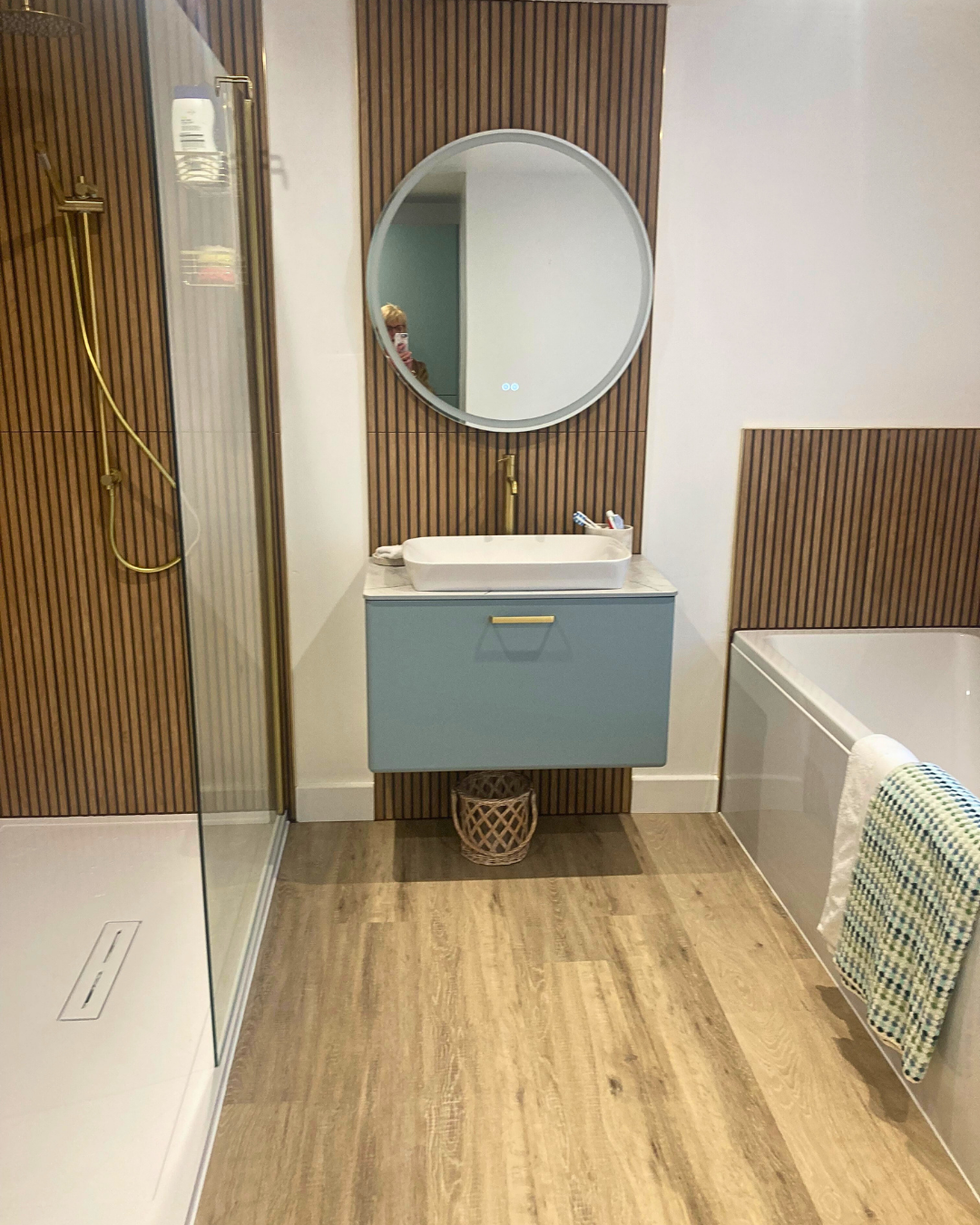 A stunning bathroom that balances space and style. The Toja Beige slatted effect tiles are striking, emulating the natural warmth and texture of wood, creating a peaceful spa like atmosphere. This setting is ideal for unwinding in the deep double ended bath after a long day. Double ended baths, with their sloped design at both ends, allow you to fully relax and indulge yourself.