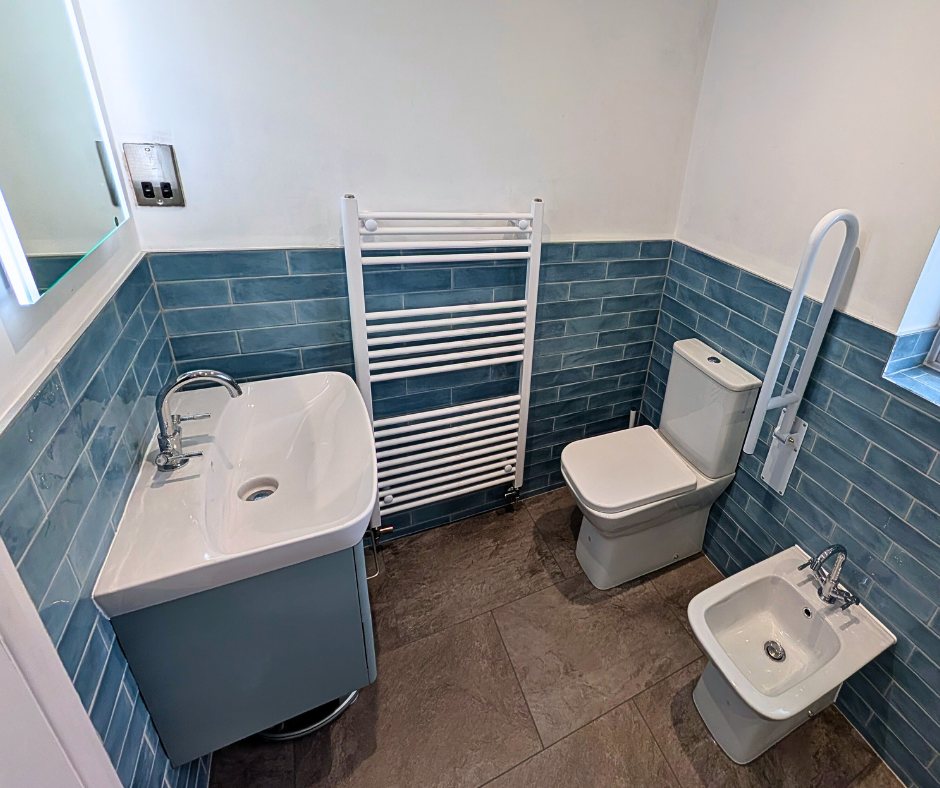 The comfort height toilet is an excellent choice for taller individuals or those with mobility challenges, as they are slightly higher than a standard toilet. Next to the toilet, a swing arm offers additional support which is easily manoeuvred down when needed and then neatly tucked away when not in use.
