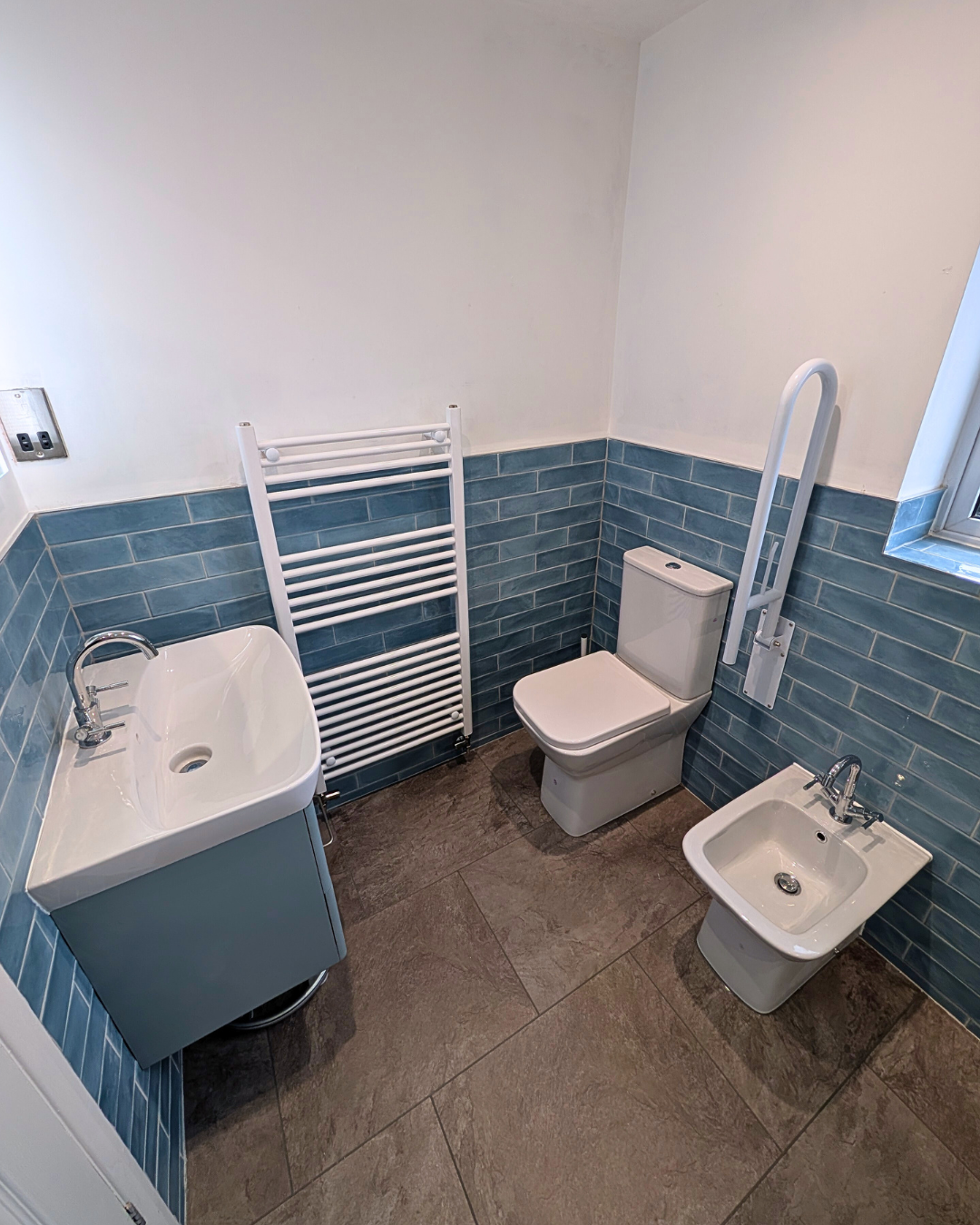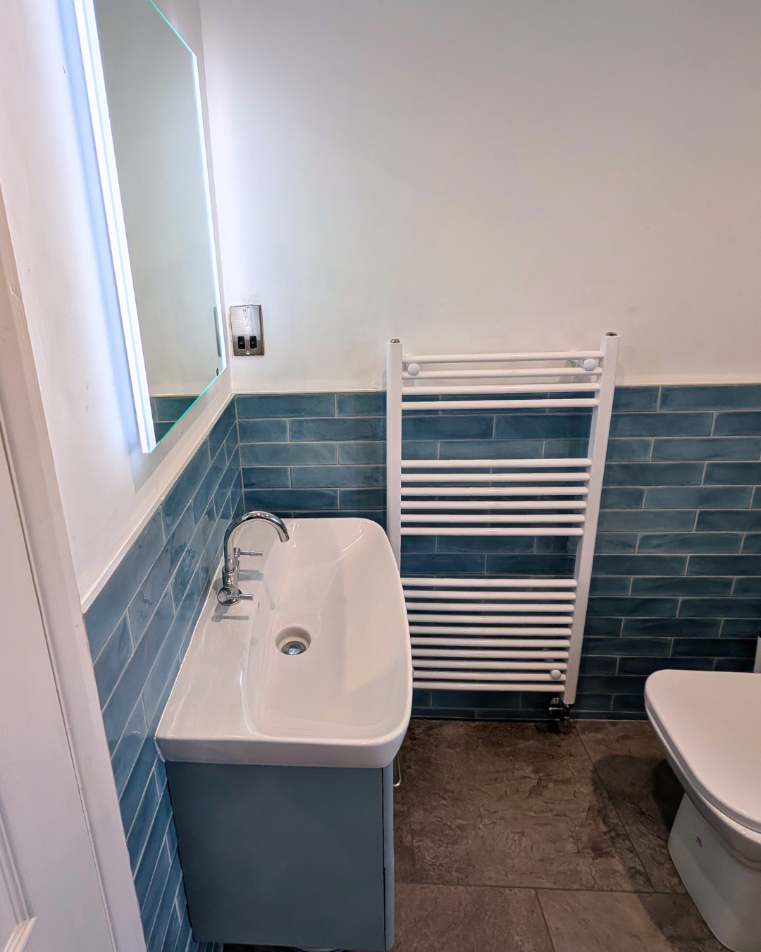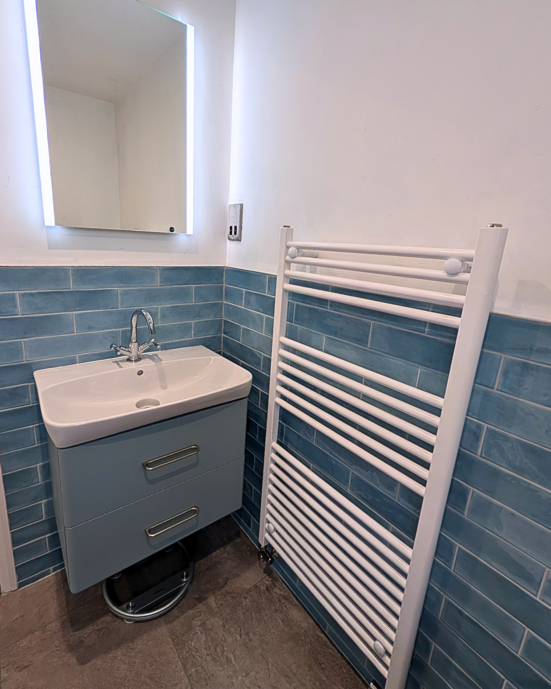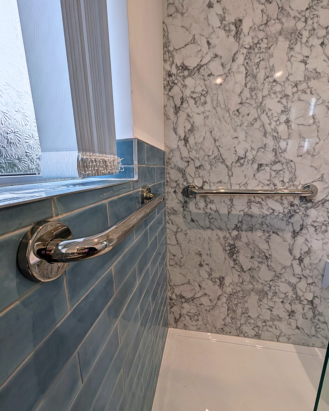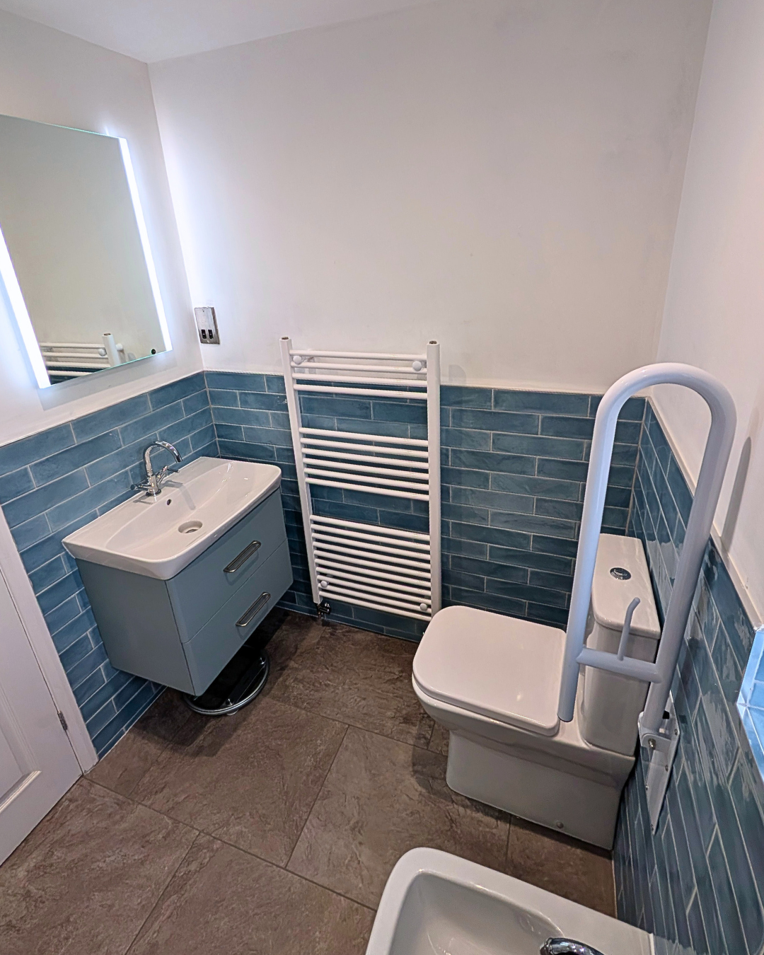 A recent bathroom installation for a lovely couple. This bathroom was installed with the customers specific needs in mind. Upon entering, you’ll find the Utopia wall hung drawer unit to the left, which is positioned beneath the illuminated mirror. Wall hung units are perfect for smaller spaces as they create the illusion of space. The Sea Green colour is a warm and tranquil colour, that pairs beautifully with the Brooklyn Sky Blue wall tiles that are installed half way up the wall. This half tiled design provides a sense of spaciousness by allowing lighter wall sections to reflect the light, creating an airy atmosphere.