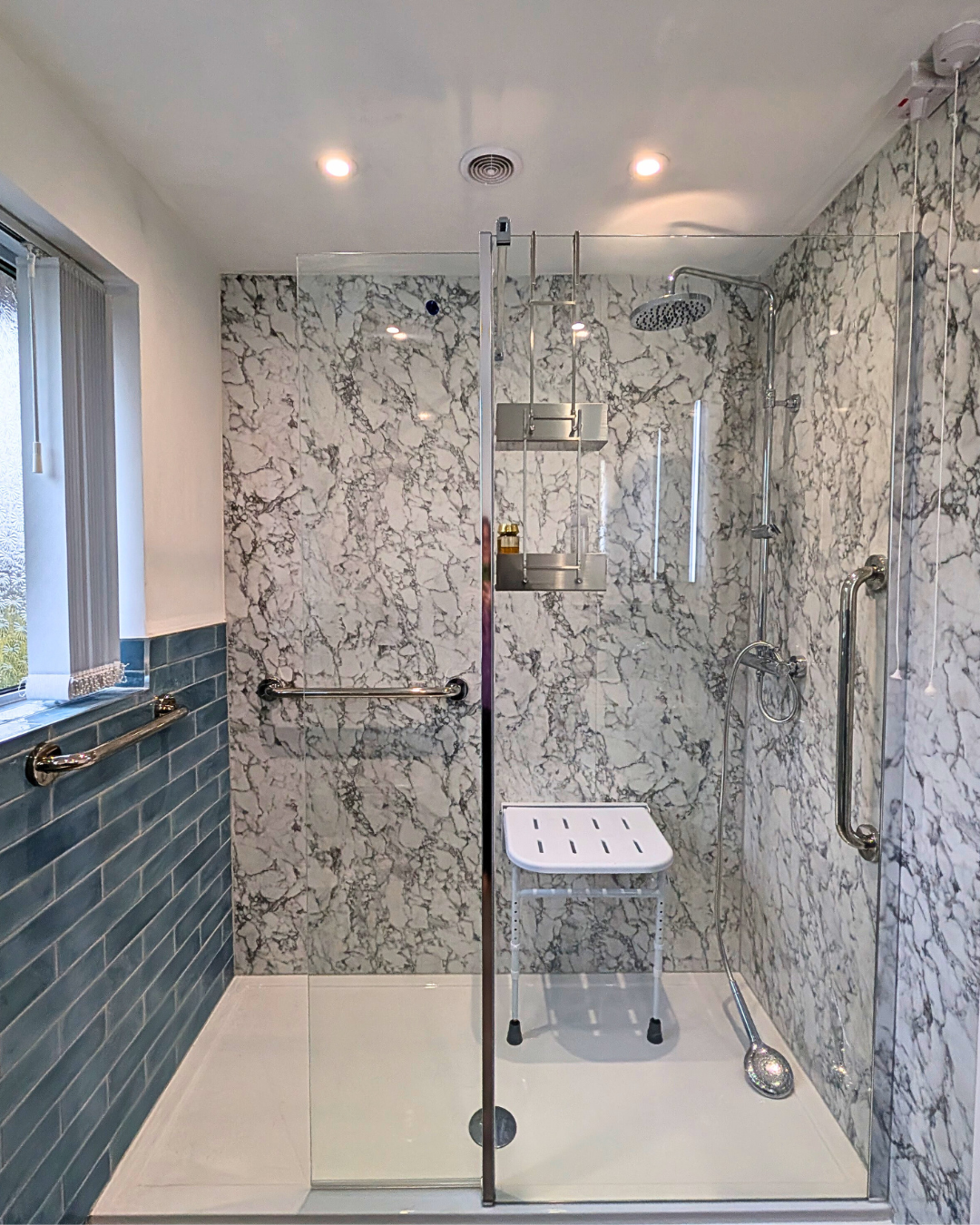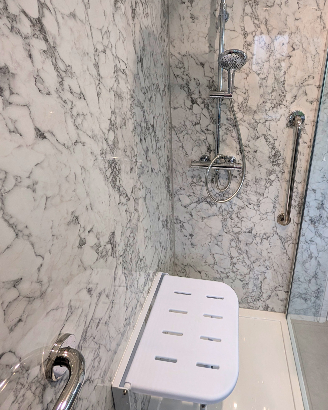 The walk in shower area is equipped with additional grab bars which are a great safety feature in any shower, Having a seat is also a useful aid for providing the user with confidence in the shower area. This handy seat will fold up when not required, making it easier for cleaning and allowing more space when not needed.