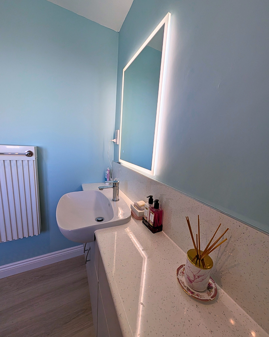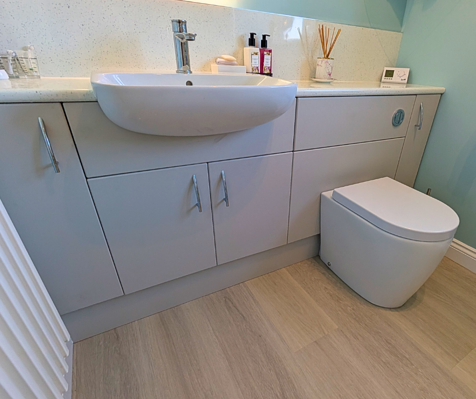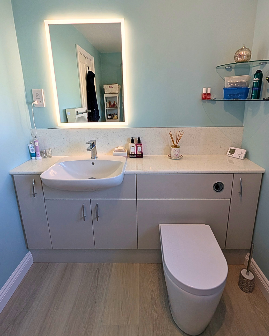 This recently fitted bathroom showcases the Nadia door style in Glacier Grey with Chrome Quill handles. The laminate worktop in White Quartz brightens the room with its subtle flecks and works perfectly alongside the Utopia Corr basin, which has gentle curves a sculpted rim.