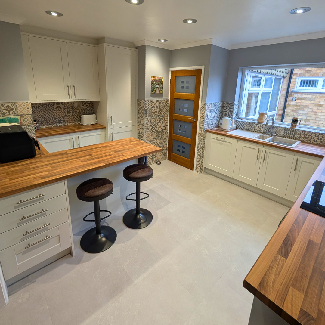 The striking Block Oak laminate worktop pairs beautifully with the kitchen. The Porcelain highlights the warm tones of the worktop, infusing the space with a sense of warmth and cosiness. This classic pairing is sure to stand the test of time!