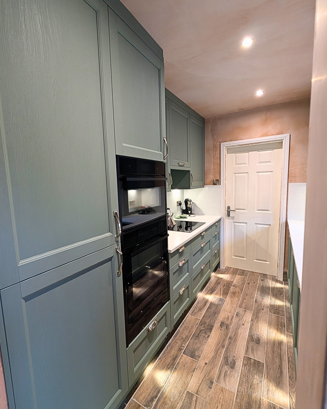 This beautiful galley kitchen benefits from our bespoke service, providing made-to-measure doors that fit various configurations tailored to your kitchen needs.
