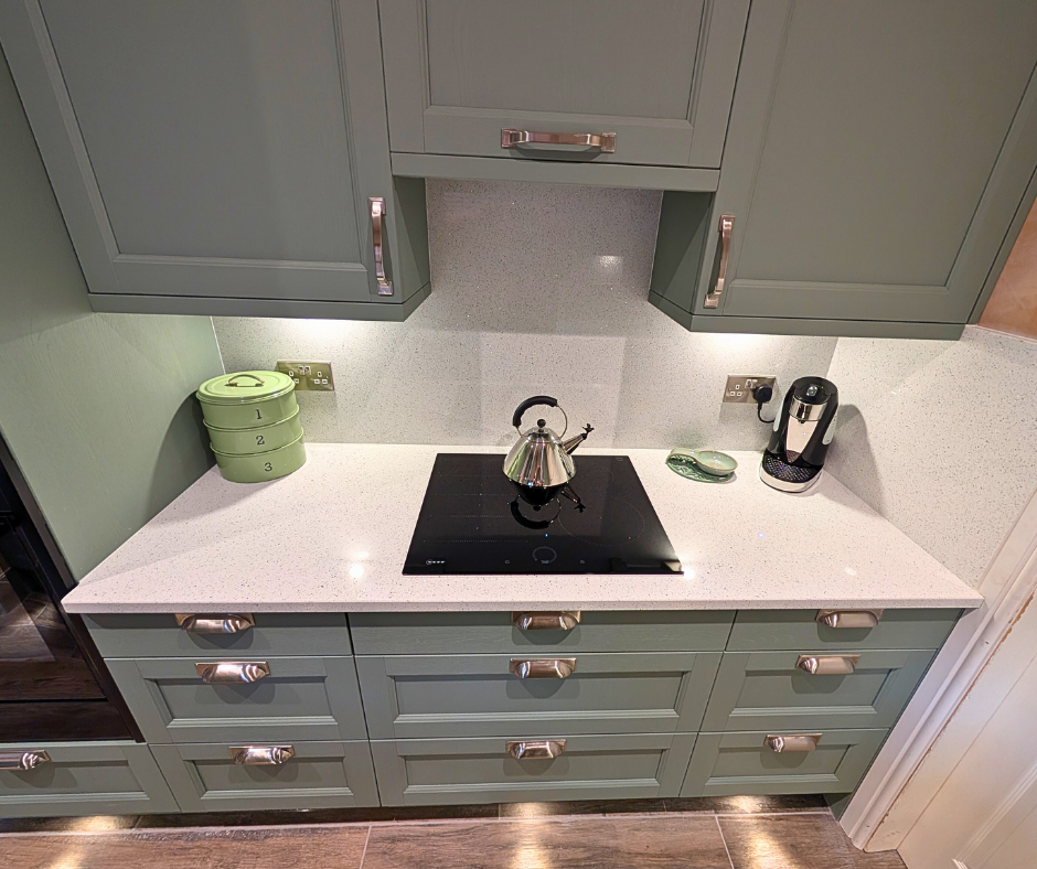 Galley kitchens are known for their long narrow layout with parallel worktops and cabinets on opposite walls, creating a central corridor. Lighting is a key element in galley kitchens, such as under cabinet lighting and plinth lighting. This prevents the space from feeling dark. The Reed Green cabinets look stunning against the clean crispness of the Quartz White sparkle worktops and tall Upstands. The Caple under mounted sink allows for a seamless flow of the worktop across the units, providing a feeling of space and openness. Behind the Induction hob, the Quartz splashback encapsulates the area, reflecting the light beautifully.
