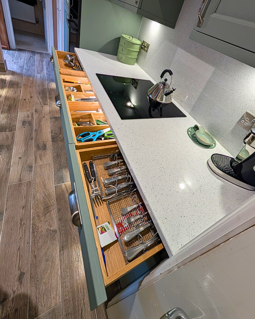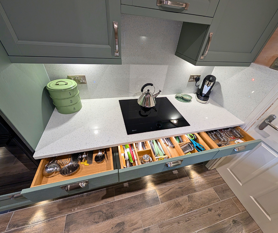 Illuminated kitchen drawers offer numerous advantages, enhancing functionality by providing light where its needed. They also highlight the stunning Oak drawer boxes, featuring an integrated cutlery compartment.