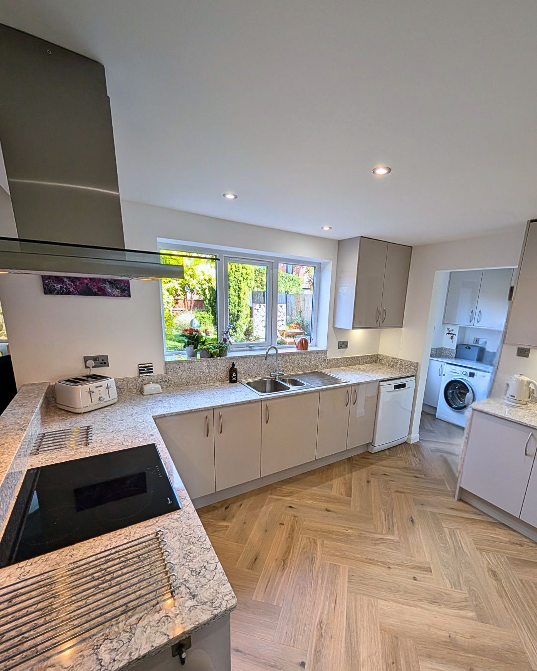 The kitchen extends into the utility area, which ties in with the overall design and offers more space for laundry etc.