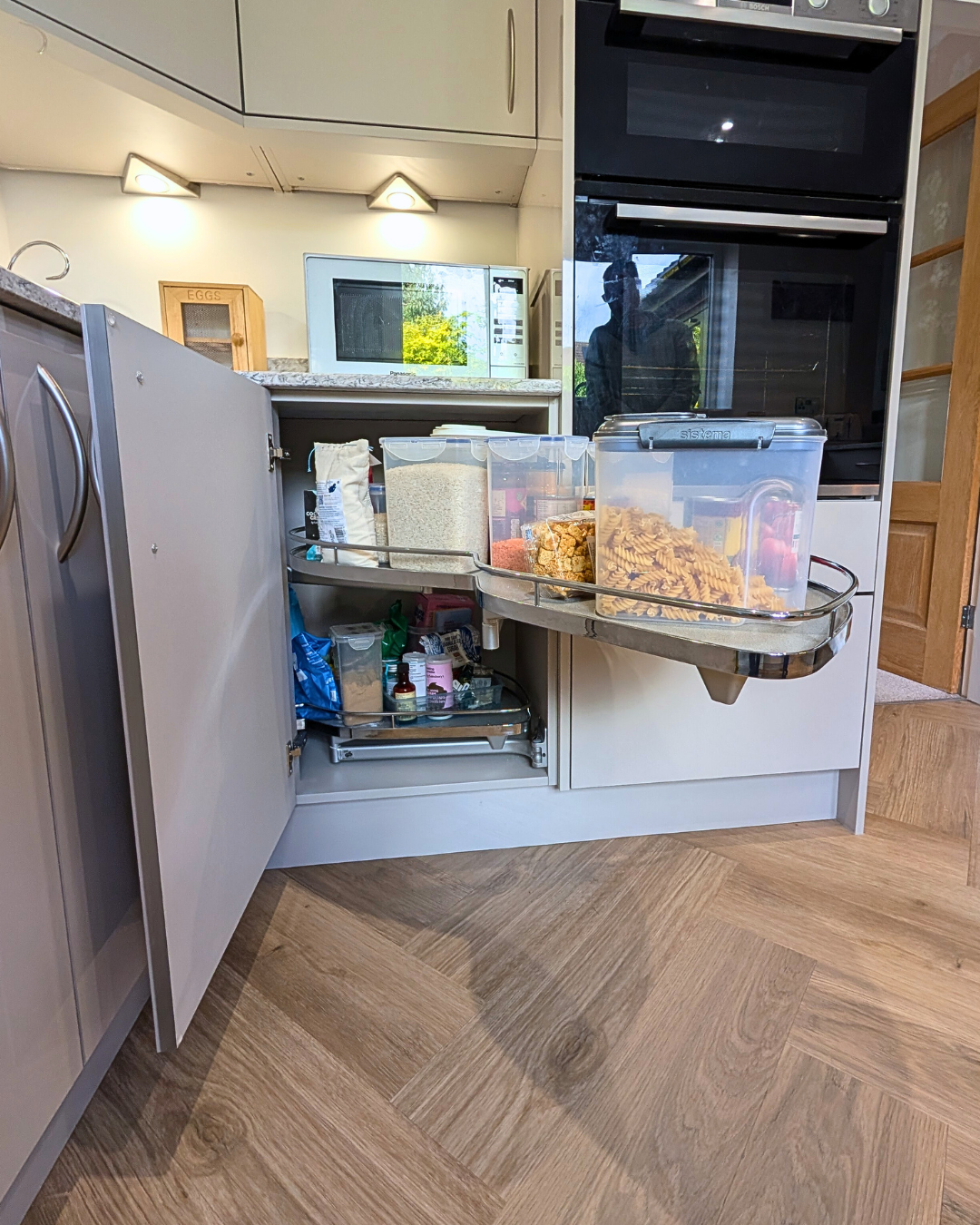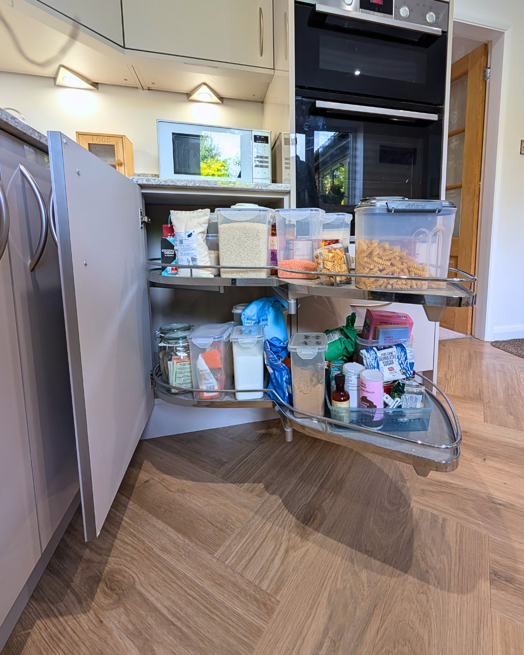 Additionally the base unit also maximises space by having a le-mans corner solution. The le-mans smoothly glides your items out for easy access, with two independent trays, allowing you to retrieve only what you need.