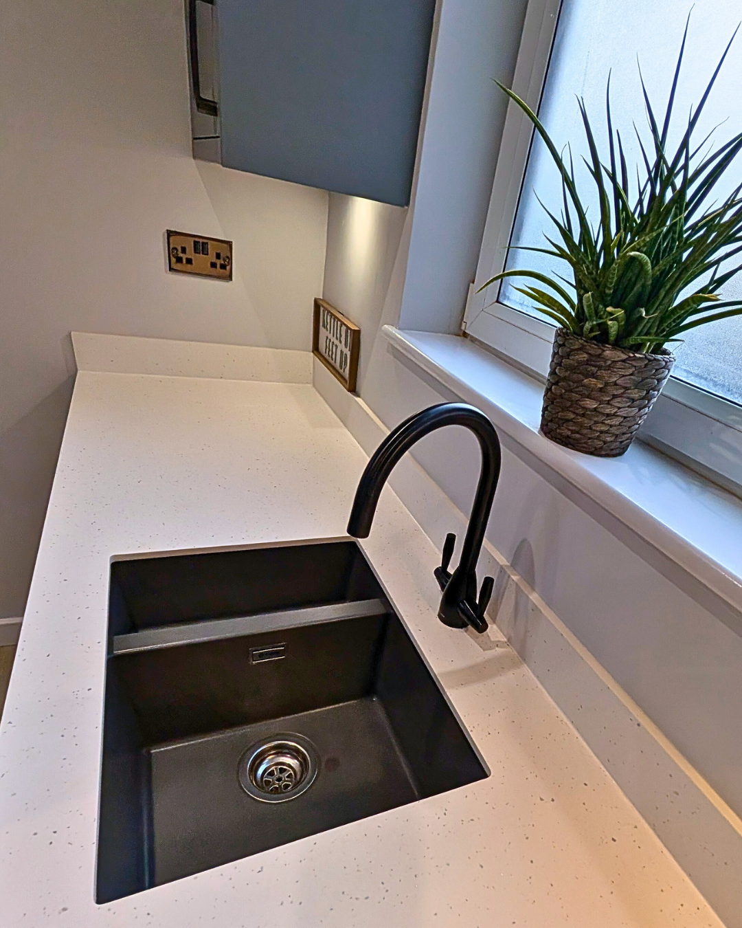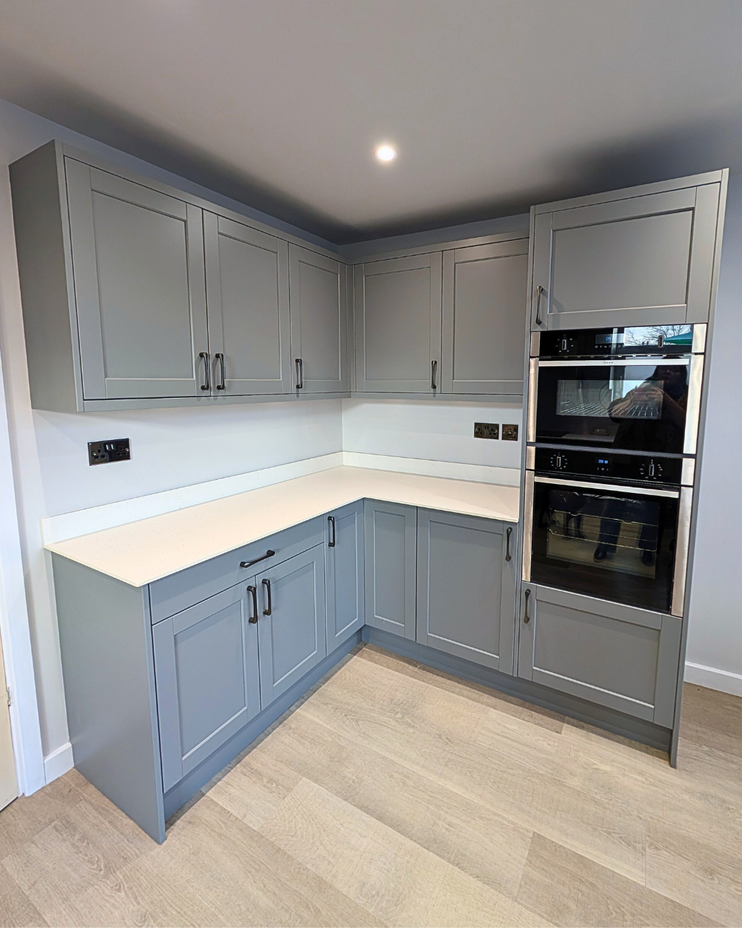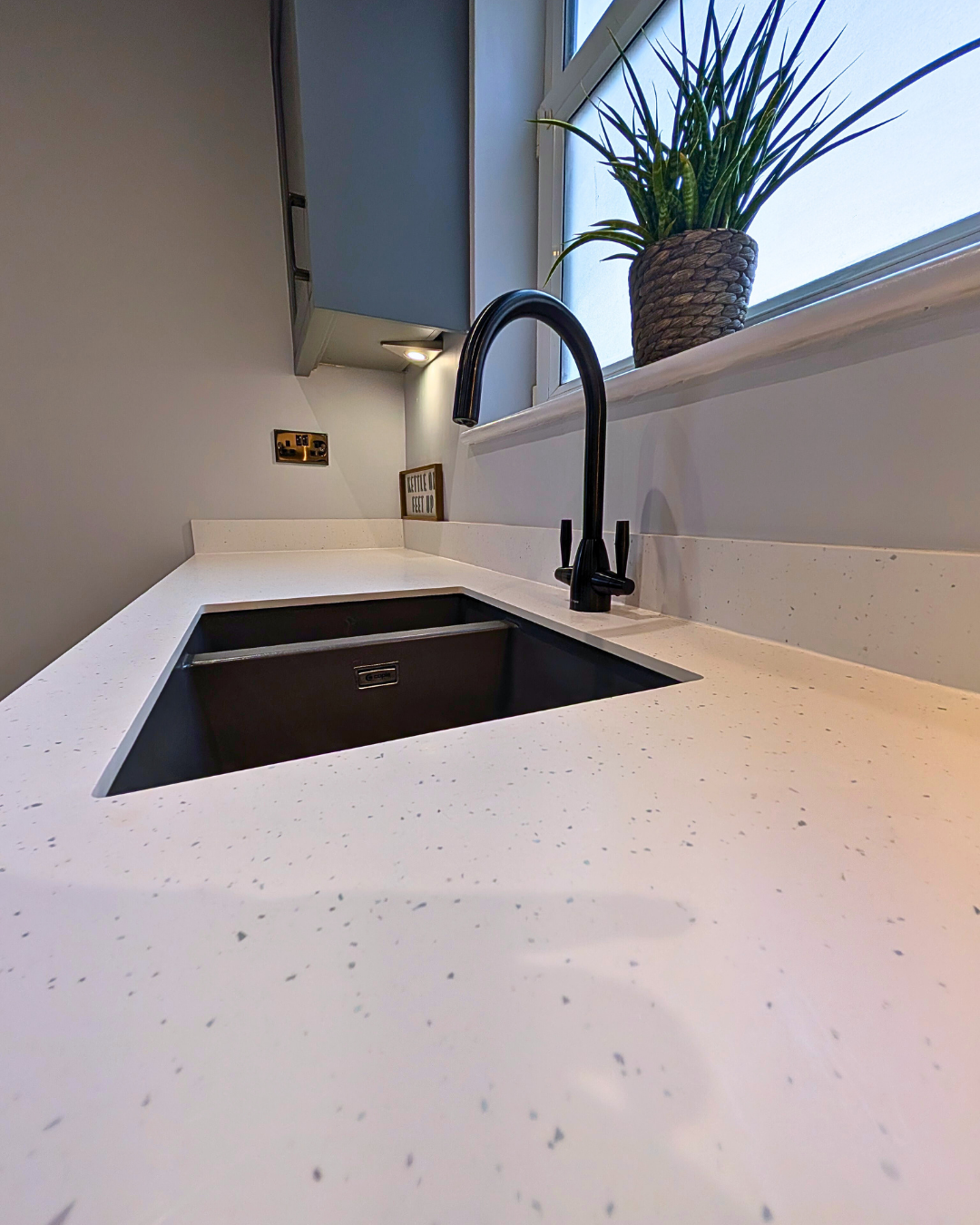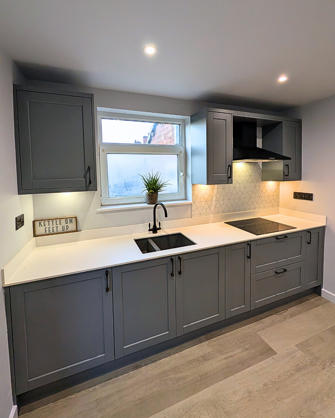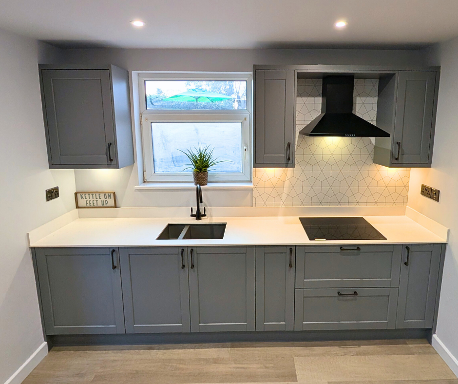 The Dust Grey kitchen is paired beautifully with the 12mm Calm White Quartz laminate worktops and Upstands. Spectras Slim Edge worktops have a hygienic design, ensuring liquids can be easily wiped away without any surface absorption, greatly reducing the growth of bacteria. The eye catching splash back has a Geometric design which creates a great feature to the room. These stunning splash backs are available in patterned or coloured options and are perfect for kitchens as they are fire, steam and heat resistant, hardwearing, scratch resistant and easy to clean!
