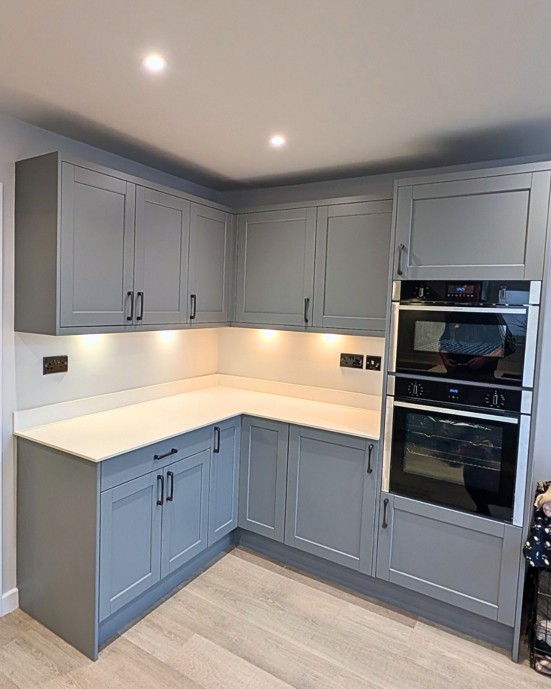 Lighting is an important factor to consider whilst planning a kitchen. In these pictures you can see the difference it makes having the lights. It instantly provides a warm and inviting space and enables you to focus on particular areas that you are working in.