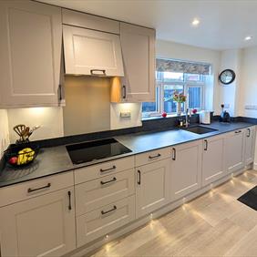 A beautiful kitchen with Second Natures Belsay Beaded in Cashmere. Belsay is a traditional shaker style door with an ornate bead around the centre panel and a wood grain finish. Cashmere is a timeless shade that is not only versatile, it creates a feeling of warmth. This kitchen perfectly demonstrates the magic of Belsay with its modern take on traditional style.