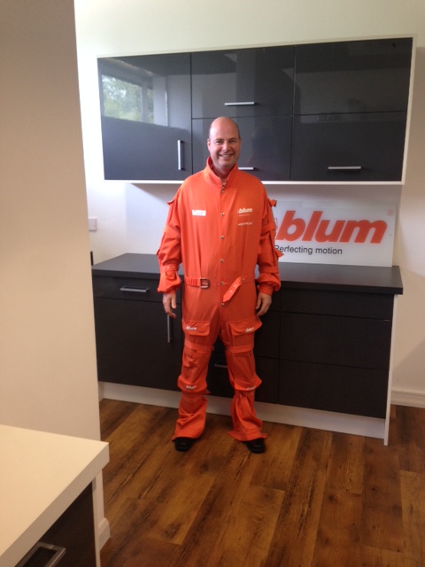 Paul & Kevin this week went to visit the Blum headquaters in Milton Keynes. They went to look at all the new clever drawer and cupboard opening solutions, this follows our new Kitchen display in the showroom having had fitted the Blum Servo Drive opening soloution, which is a electric motion support system, with just a push of the door fascia the cupboard will auto open, and a push of the button will then close, a real wow factor within a kitchen. This solution is also a great idea for people vertically challenged. While visting Blum Paul was asked to don the "Aged Suit" which is meant to replicate the feeling of 20 years older than his age. We just thought it was a good idea to get some images of him up for our amusement.