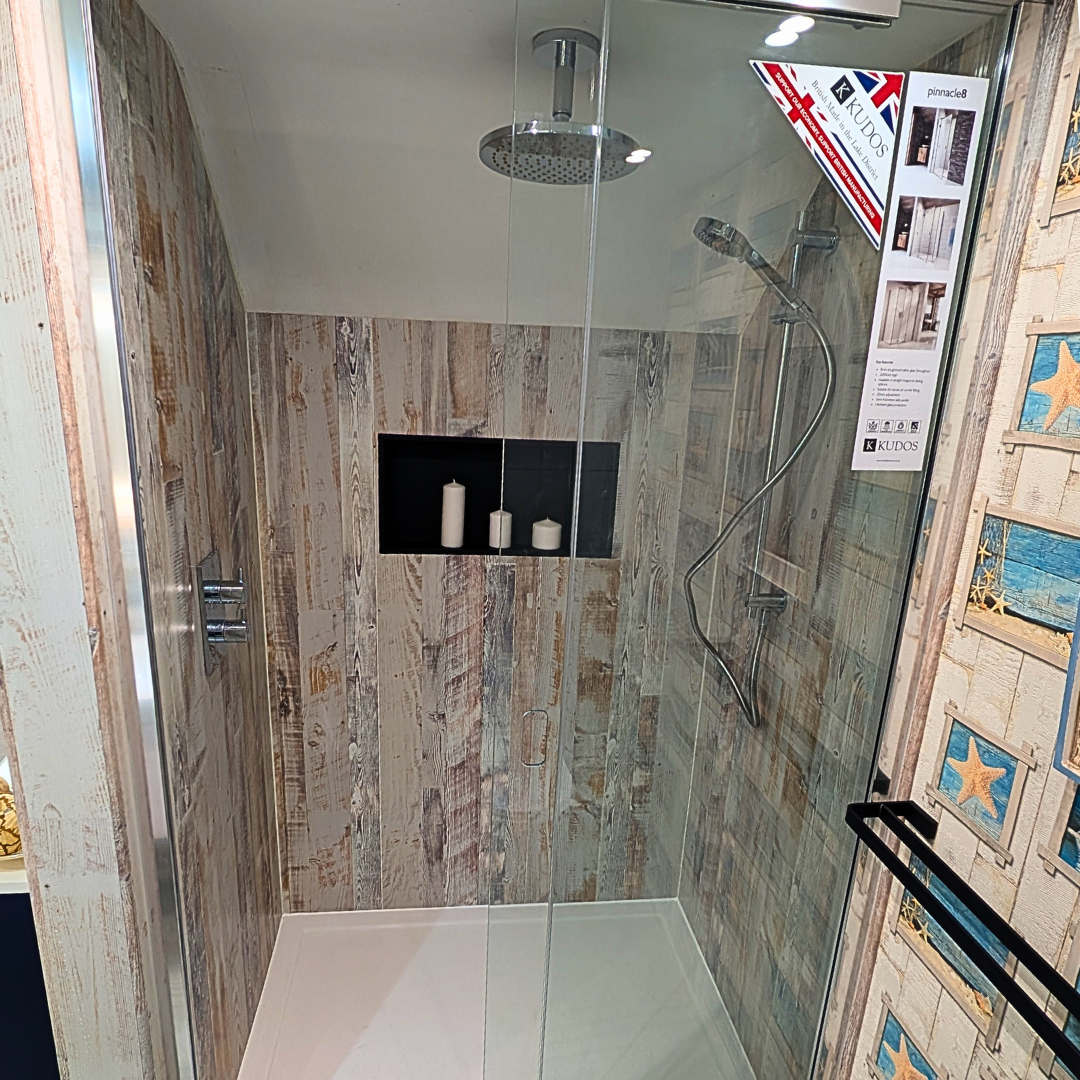 We are loving the new wet wall panels in our displays. Shown here are White Lightening Fossil and Chalk Pine.